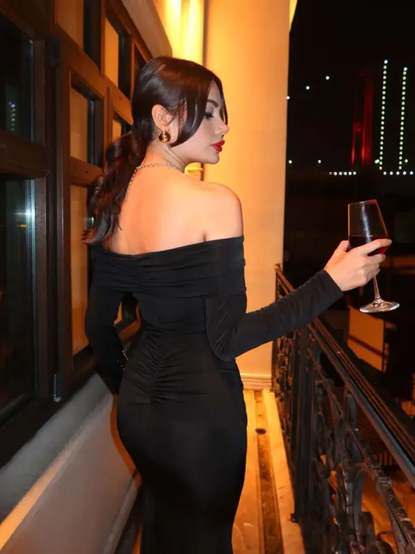 Elegantna rastezljiva maxi haljina sa spuštenim ramenima savršen je izbor za sofisticirane prilike. Dizajn s dodatkom dužih krajeva sprijeda donosi jedinstven i dinamičan izgled, dok se haljina pri dnu blago širi, elegantno naglašavajući figuru.