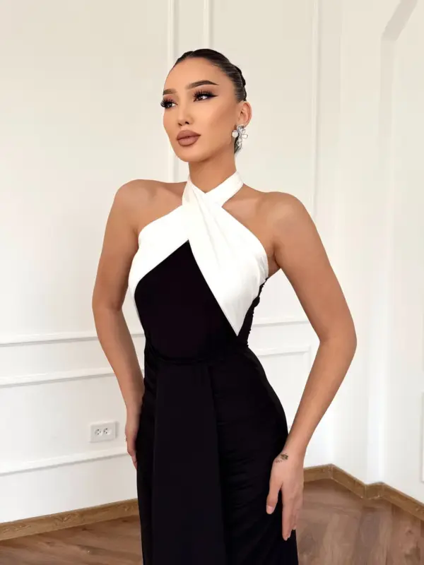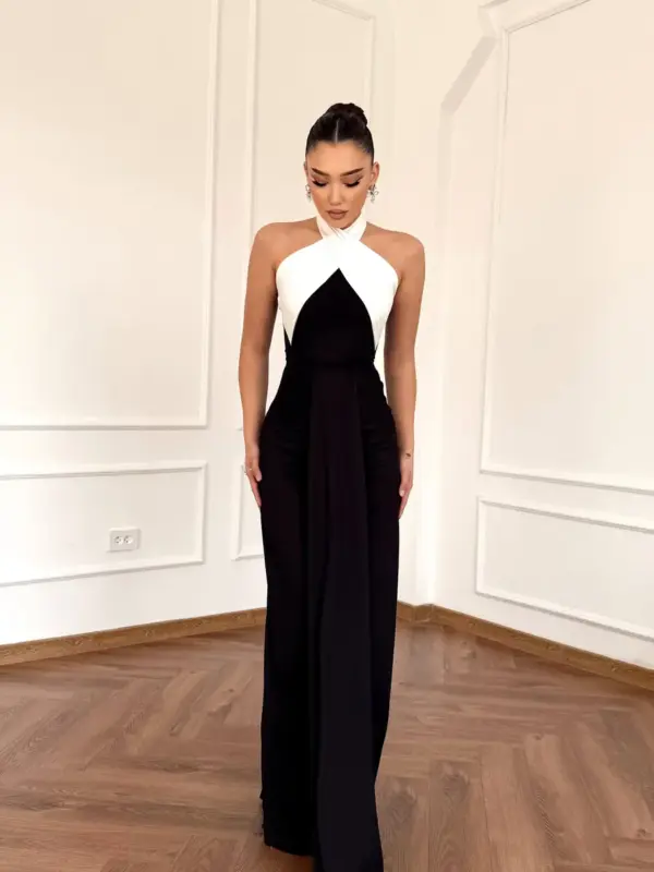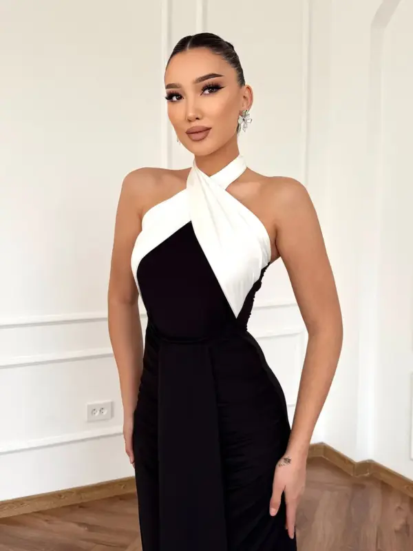 Crno-bijela kombinacija nikad ne izlazi iz mode, ali kad je spojiš u ovako dramatičnu siluetu – dobiješ haljinu koja će ukrasti sve poglede. Gornji dio je dizajniran s elegantnim preklopom koji se veže oko vrata i naglašava ramena i dekolte, dok donji dio prati liniju tijela i završava sa suptilnim naborima i zavjesom koja pada niz nogu.