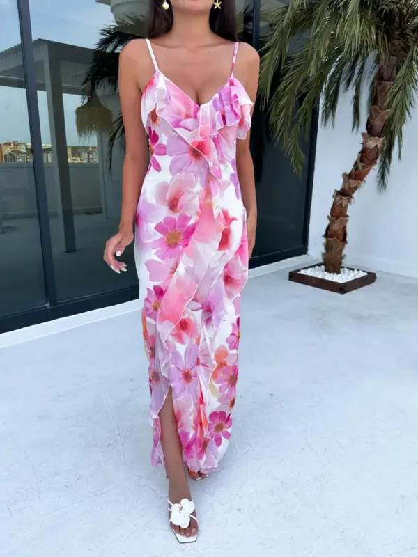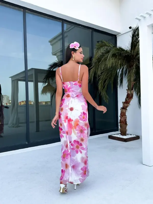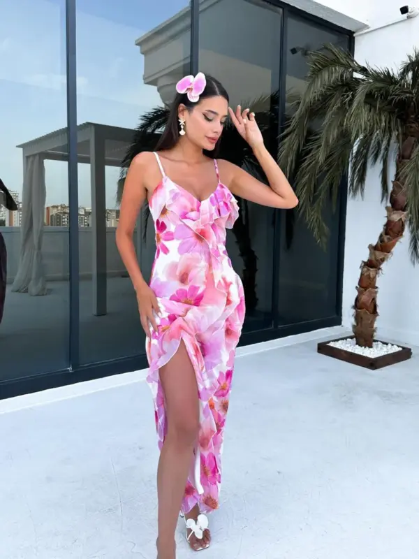 🔹 Detalji: Cvjetni print, volani, podesive bretele, podstavljena, ziper nazad, prorez na nozi