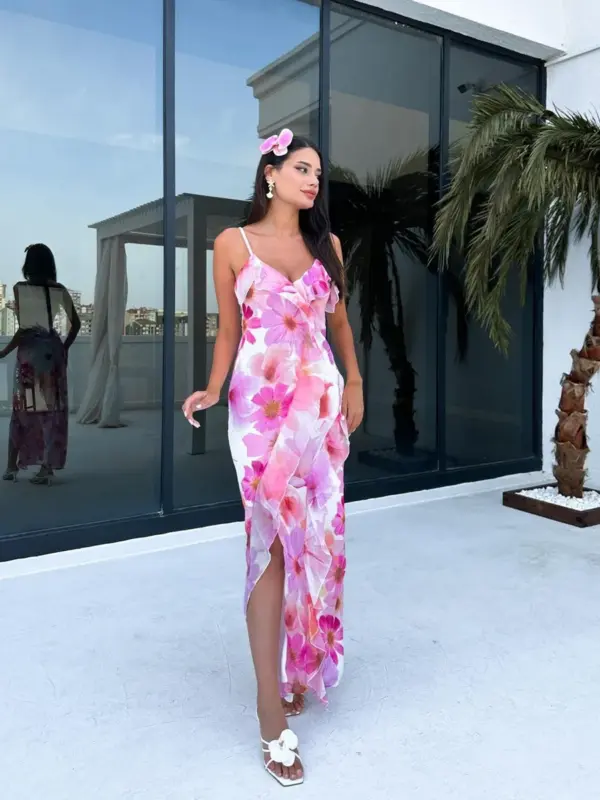 Ova romantična maxi haljina je savršen izbor za ljetne svečanosti i događaje! Predivan cvjetni print u nježnim nijansama roze i bijele unosi svježinu i šarm. Kroj prati liniju tijela, dok raskošni volani koji se spuštaju niz haljinu stvaraju lepršav i elegantan izgled.
