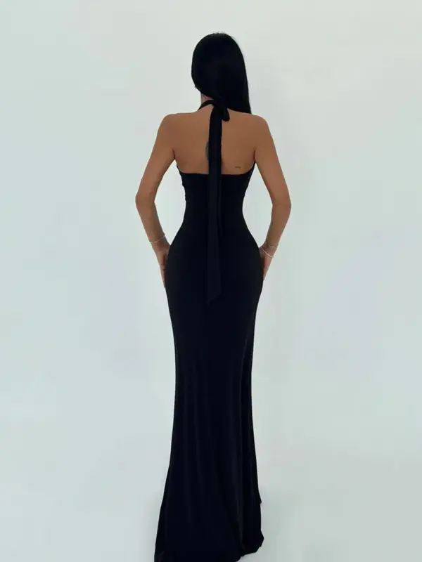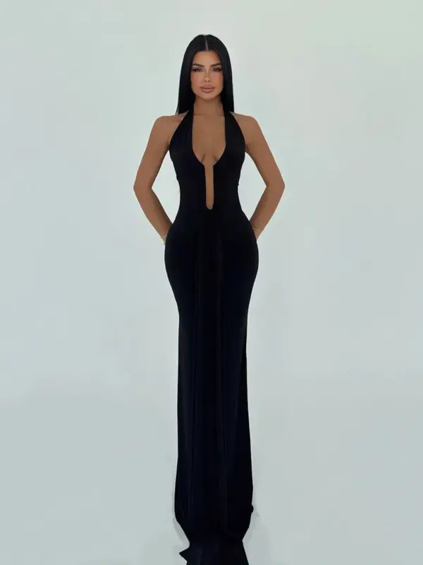 Budite neodoljivi u ovoj senzualnoj crnoj maxi haljini koja odiše glamurom! Duboki otvoreni dekolte i halter stil koji se veže oko vrata stvaraju dramatičan i privlačan izgled. Haljina prati liniju tijela, naglašavajući obline, a dugi kroj donosi sofisticiranost.