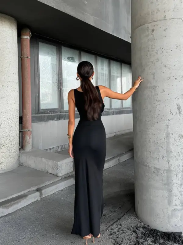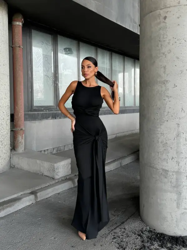 Ova maxi haljina bez rukava s prednjim detaljima za vezanje odiše svestranošću i elegancijom. Rastezljiv materijal prilagođava se tijelu, dok se pri dnu blago širi za slobodu pokreta. Mogućnost vezanja na više načina pruža kreativnost u stiliziranju, omogućavajući da svaki put izgledate drugačije. Bez izreza, jednostavna je za kombiniranje s raznim dodacima. Njega: Prati na 30°C, izbjegavati sušenje u sušilici, a peglati s zaštitnom tkaninom preko za očuvanje materijala.
