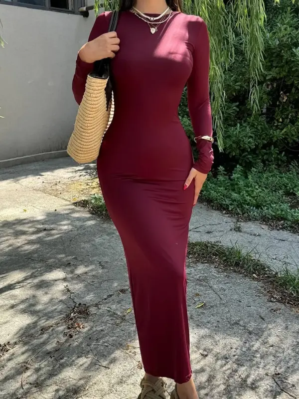 Ova maxi haljina od udobnog, elastičnog materijala savršena je za svakodnevne kombinacije. S okruglim ovratnikom i dugim rukavima, haljina pruža jednostavan i sofisticiran izgled bez suvišnih detalja ili izreza.