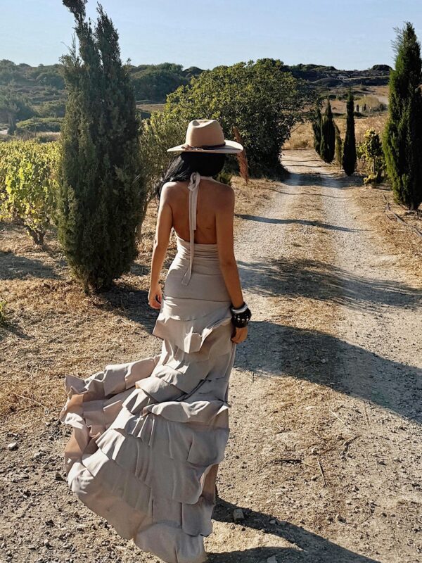Dramatična „statement” haljina koja grudima daje mekani pad, struk suptilno naglašava, a volani stvaraju wow efekat pri svakom koraku.