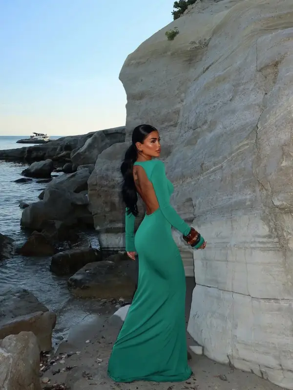 Maxi elastična haljina sa otvorenim leđima, blago providna.
