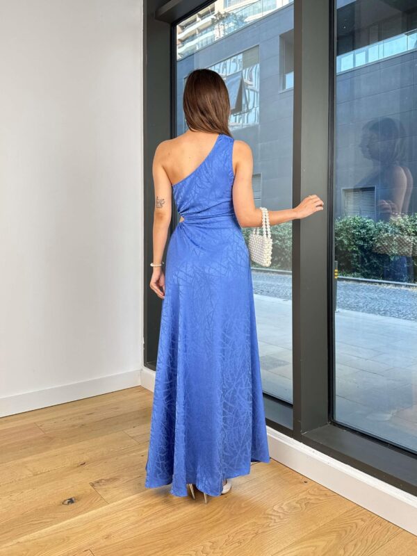 Ova sofisticirana haljina na jedno rame odiše gracioznošću i ženstvenošću. Asimetričan kroj ističe ramena, dok efekat naboranog struka s diskretnim izrezom stvara figuru pješčanog sata. Lepršava tkanina s decentnim sjajem i teksturom čini ovu haljinu savršenim izborom za svečane prilike i posebne večernje događaje.