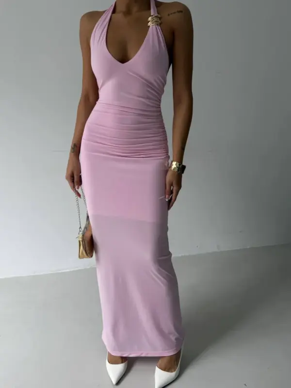 🔸 Halter vezanje oko vrata 🔸 Dekorativni zlatni prstenovi 🔸 Rastezljiv materijal koji oblikuje tijelo 🔸 Dužina: maxi 🔸 Boja: pastelno roze