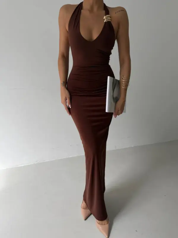 🔸 Halter vezanje oko vrata 🔸 Dekorativni zlatni prstenovi 🔸 Rastezljiv materijal koji oblikuje tijelo 🔸 Dužina: maxi 🔸 Boja: pastelno roze