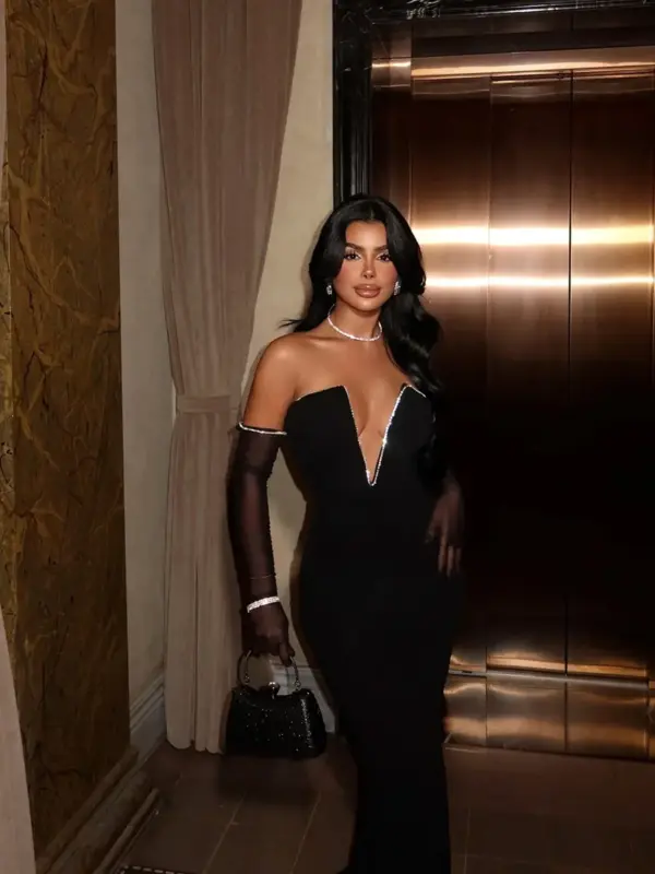 Maxi haljina, elegantna, bez naramenica, sa dubokim dekolteom i sofisticiranim detaljima cirkona. Presječena ispod grudi kako bi dodatno naglasila figuru, dok se pri dnu širi u zvonast kroj za graciozan izgled. Zipper na leđima olakšava oblačenje.