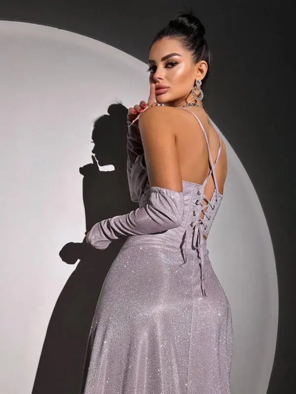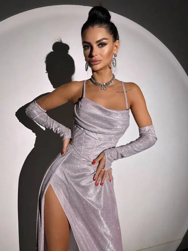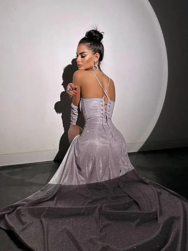 Zablistaj u ovoj očaravajućoj haljini sa opadajućim šljokicama koja savršeno prati liniju tijela. Kroj s tankim naramenicama, korzet detaljima i zavodljivim prorezom ističe tvoju figuru i dodaje dozu elegancije. Vezanje na leđima pruža dodatnu prilagodljivost i sofisticiran izgled.