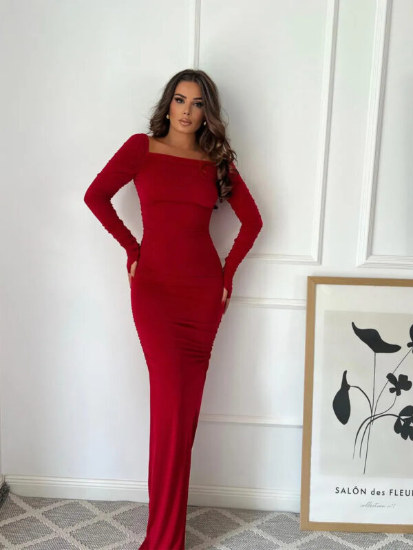 Maxi haljina sa spuštenim rukavima i naborima. Sadrži elastin, rastezljiva je i prilagođava se obliku tijela. Sa strane ima izrez. Upute za pranje: prati na 30°C, ne sušiti u sušilici, peglati s tkaninom preko ili parom.