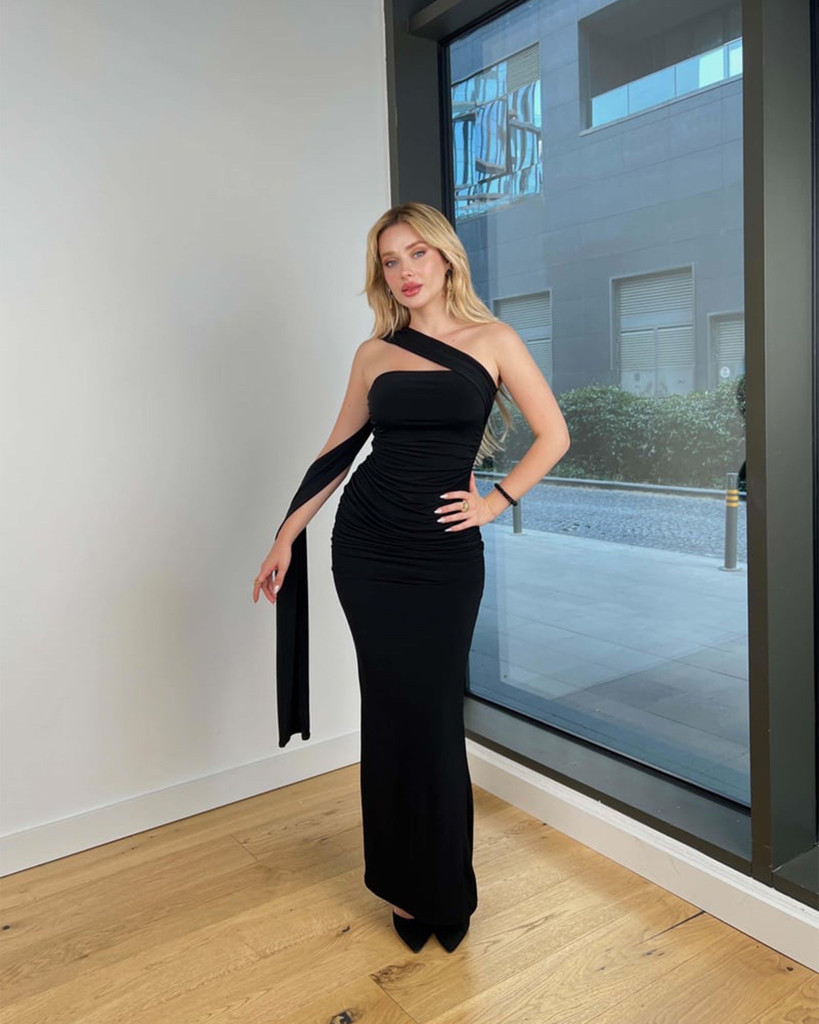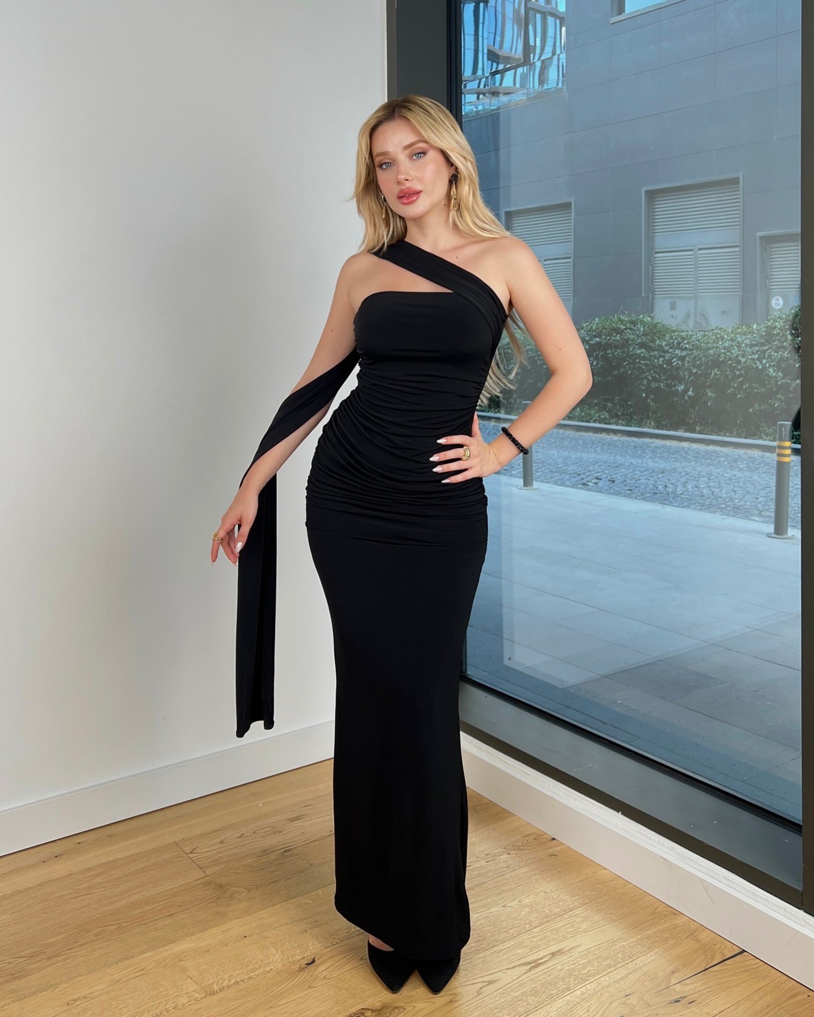 Ova svečana maxi haljina kombinuje udobnost i eleganciju, savršena za posebne prilike. Nabrani dio u struku omogućava prirodno prilagođavanje figuri, ističući siluetu na prefinjen način. Na dnu haljine nalazi se izrez, koji olakšava kretanje i dodaje dozu ležerne elegancije. Donji porub haljine nije obrađen.