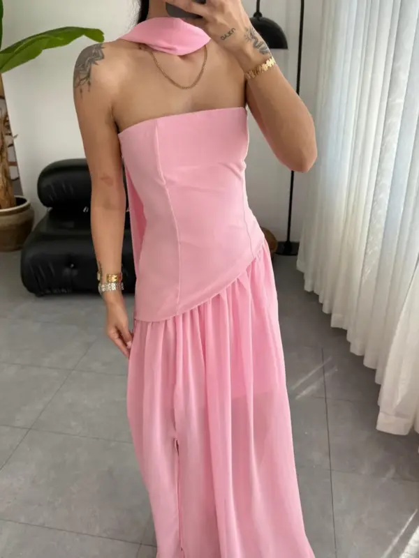Ova senzualna maxi haljina je savršen izbor za posebne prilike kada želite izgledati glamurozno i privlačno! Kroj bez bretela s ravnim dekolteom i otvorenim leđima s vezanjem donosi dozu drame i elegancije.