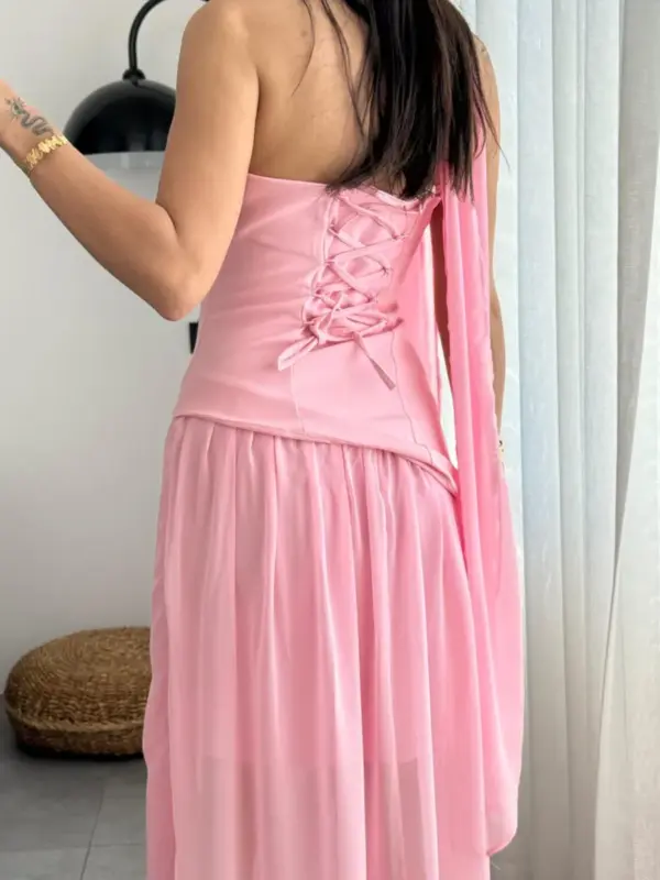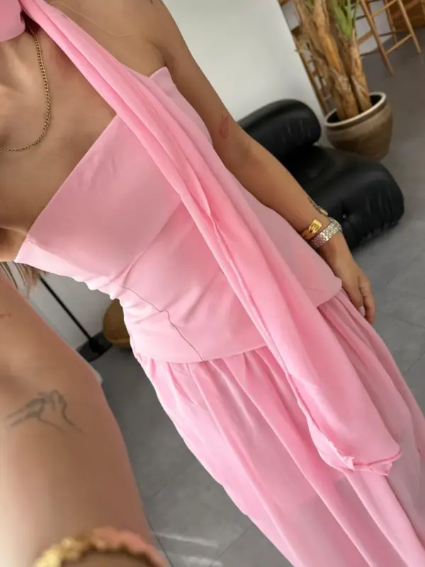 🔹 Kroj: Maxi haljina, bez bretela, korzet gornji dio, otvorena leđa, lepršav donji dio s prorezom
