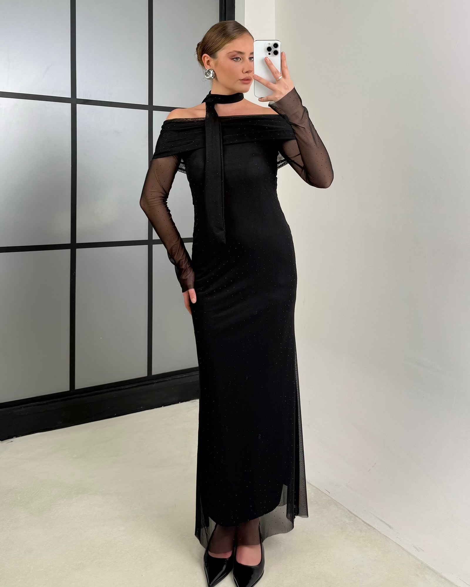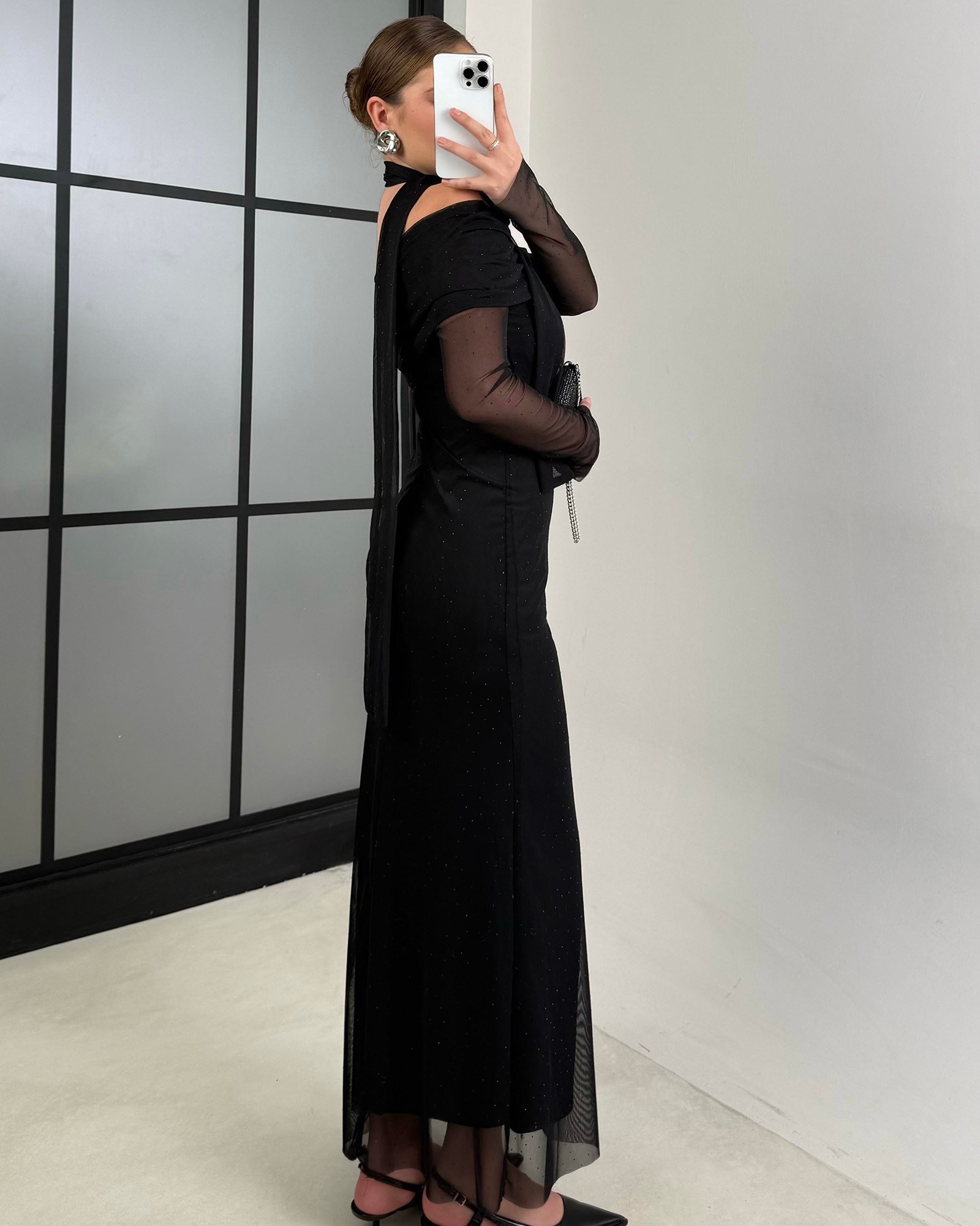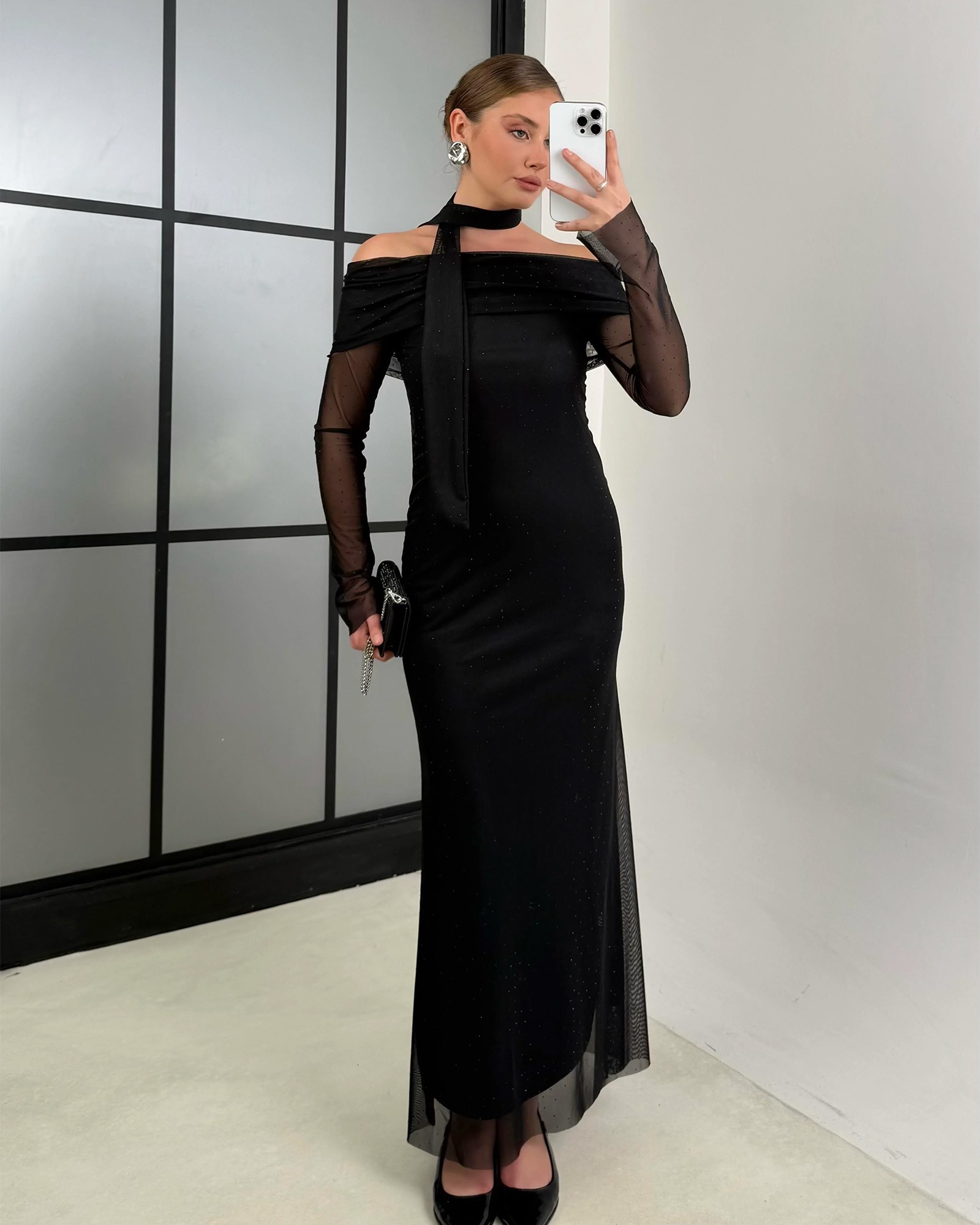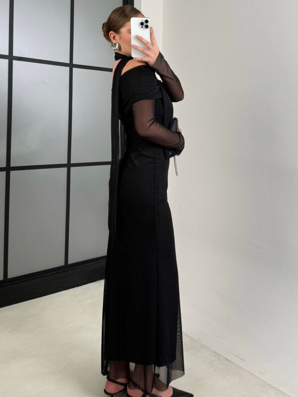 Prozirni mrežasti rukavi ukrašeni sitnim cirkonima osiguravaju elegantan sjaj pri svakom pokretu, a dodatni šal koji dolazi uz haljinu omogućava više stilova vezivanja oko vrata.