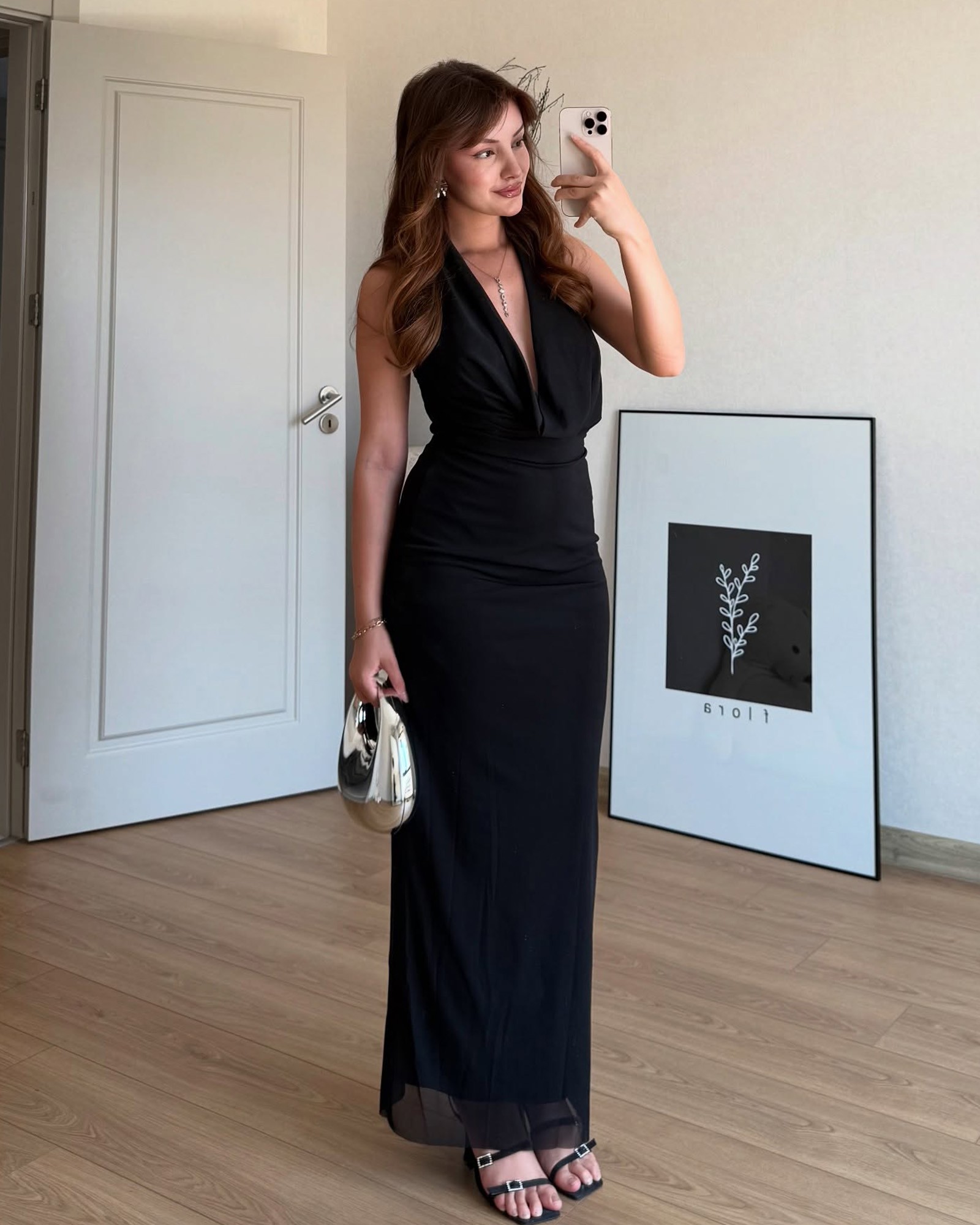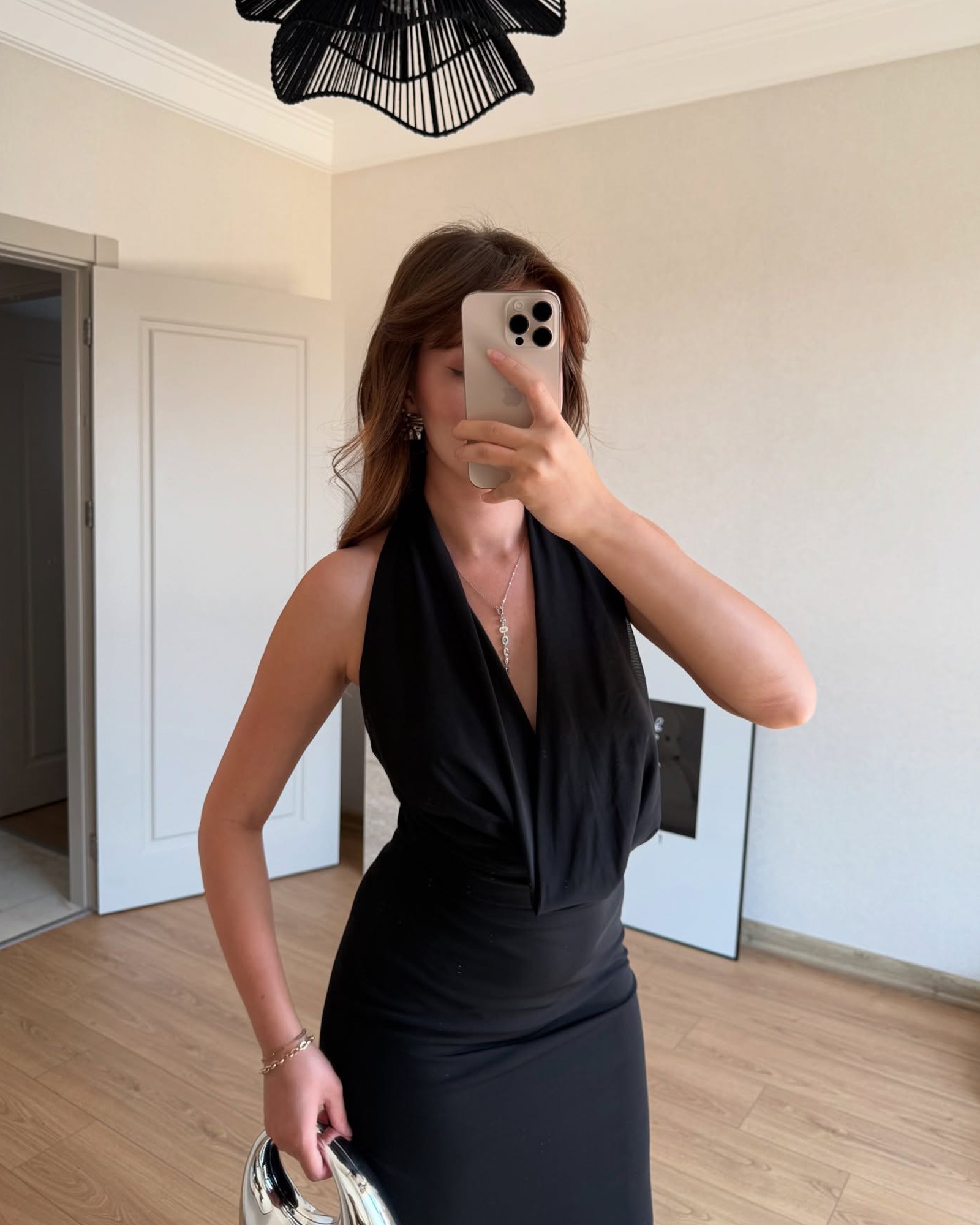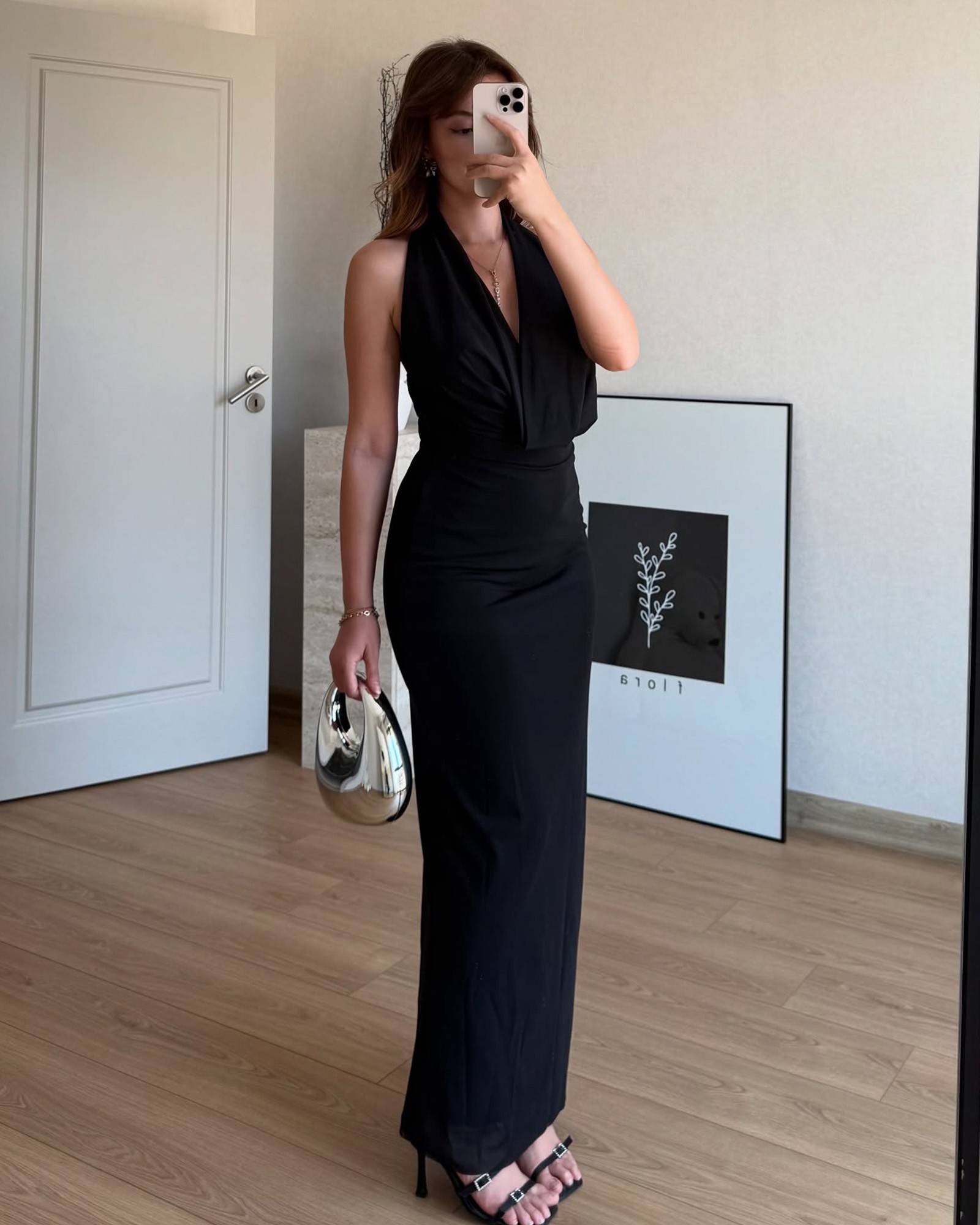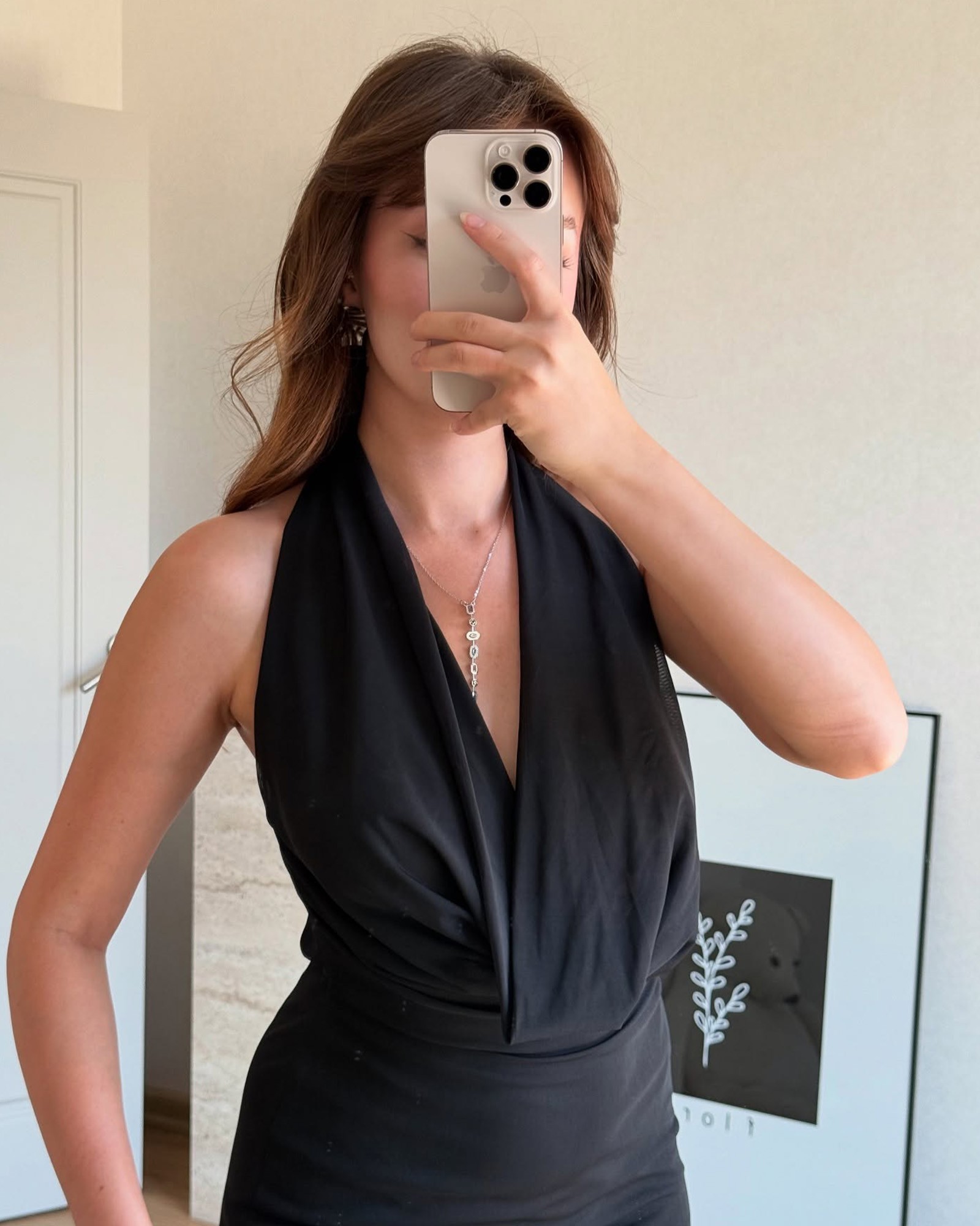 - Izrez: Halterneck s nježnim V-izrezom i drapiranim preljevima
