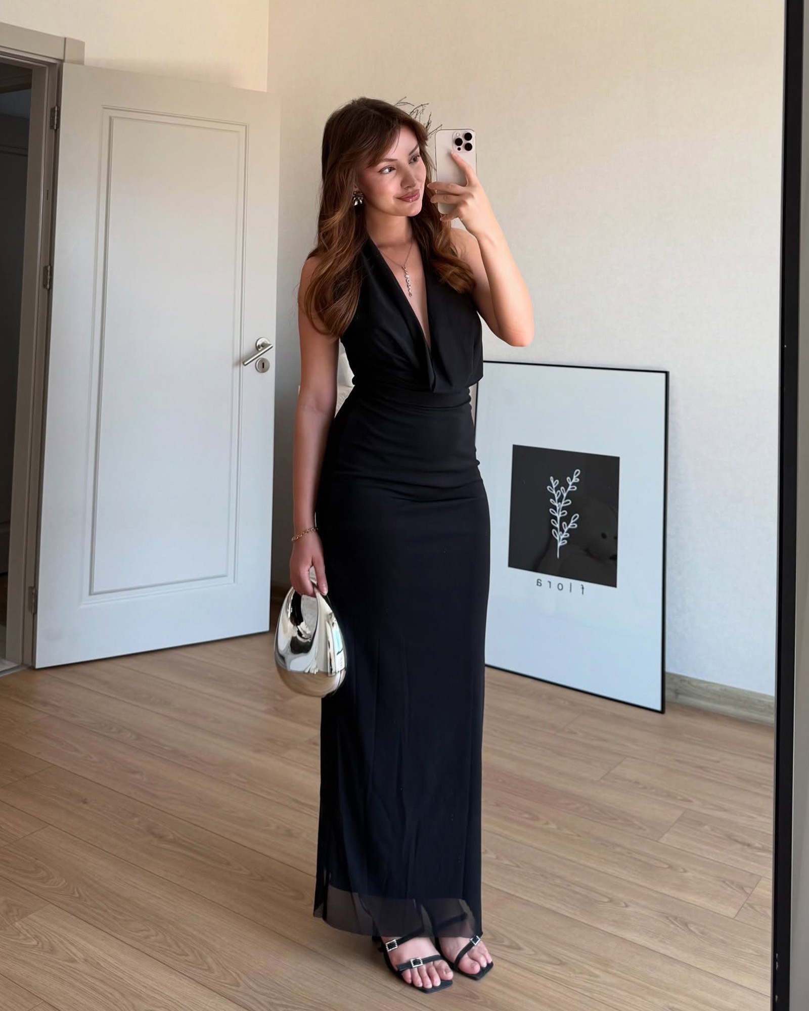 Ova profinjena maxi haljina kombinira sofisticirani drapirani gornji dio s umjereno razigranim, blago prozračnim donjim rubom. podstavljena, pruža udobno pristajanje u gornjem dijelu, dok lepršav kroj suptilno klizi uz noge, ističući prirodnu eleganciju figure. Neobrađeni donji porub unosi modernu, malo neformalnu notu.
