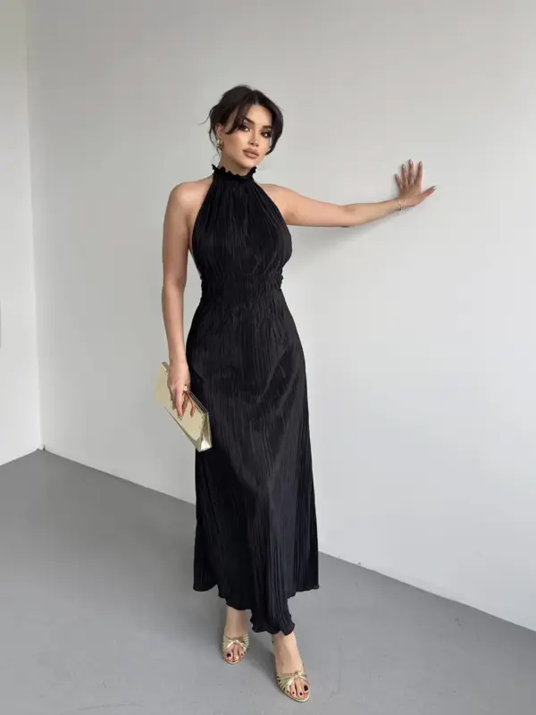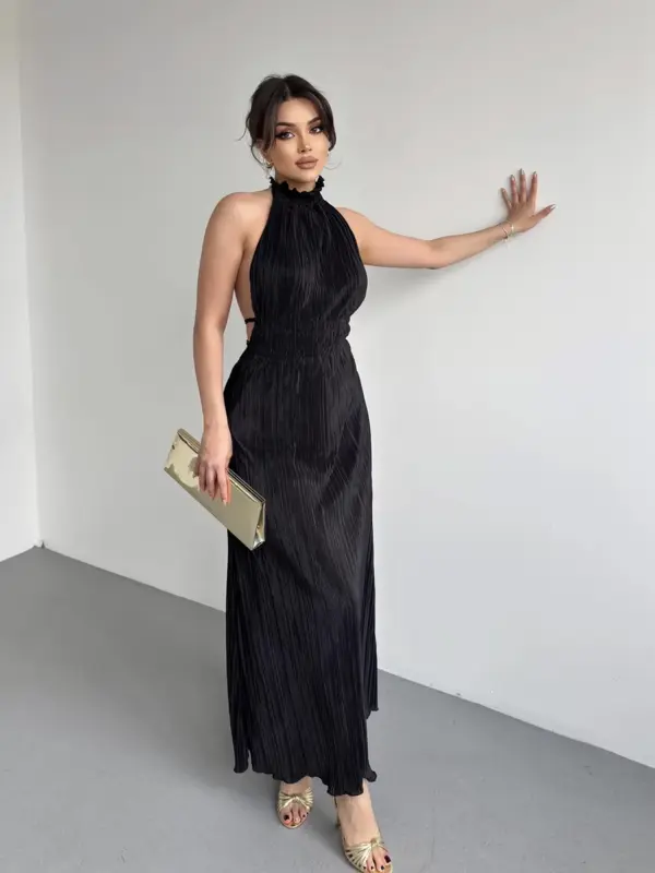 Ova maxi haljina plisiranog dizajna donosi dozu sofisticiranosti i ženstvenosti. Otvorena leđa i vezanje oko vrata stvaraju zavodljiv izgled, dok volan detalj oko vrata dodaje nježnu, romantičnu notu. Presjek u struku ističe figuru, a široki A-kroj pruža lepršavost i eleganciju pri svakom koraku.