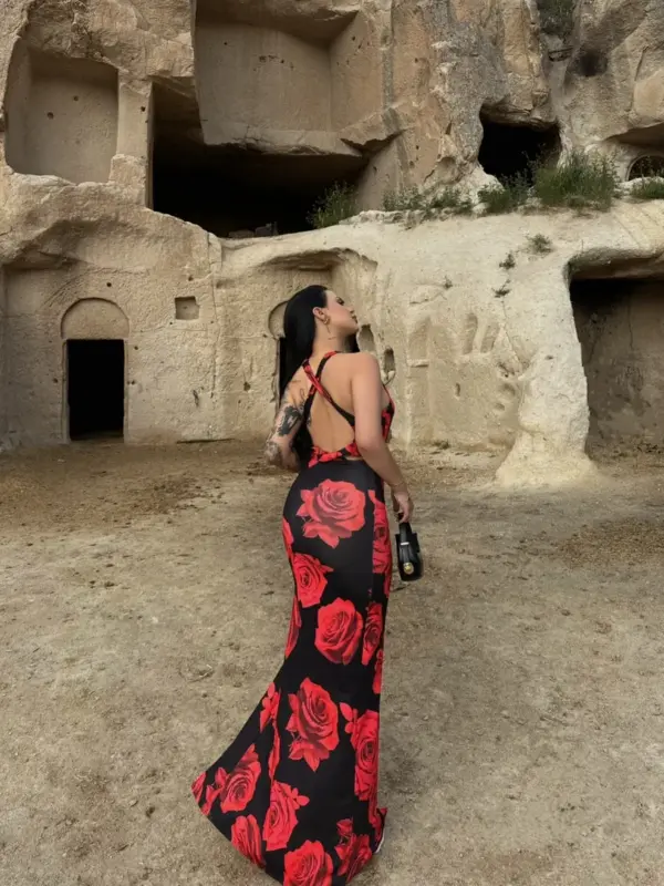 Ova dramatična maxi haljina je savršen izbor za sve prigode gdje želite ostaviti snažan i strastven dojam! Upečatljiv print crvenih ruža na crnoj podlozi donosi dozu romantike s tamnom notom. Haljina prati liniju tijela, naglašavajući obline.