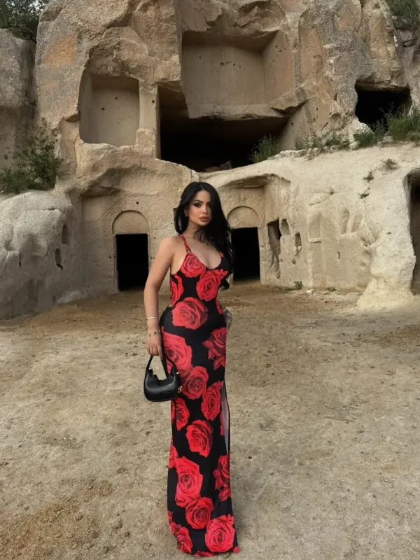 🔹 Detalji: Print crvenih ruža, izrezi na leđima i boku, visoki prorez na nozi