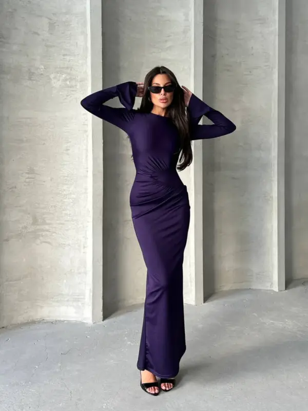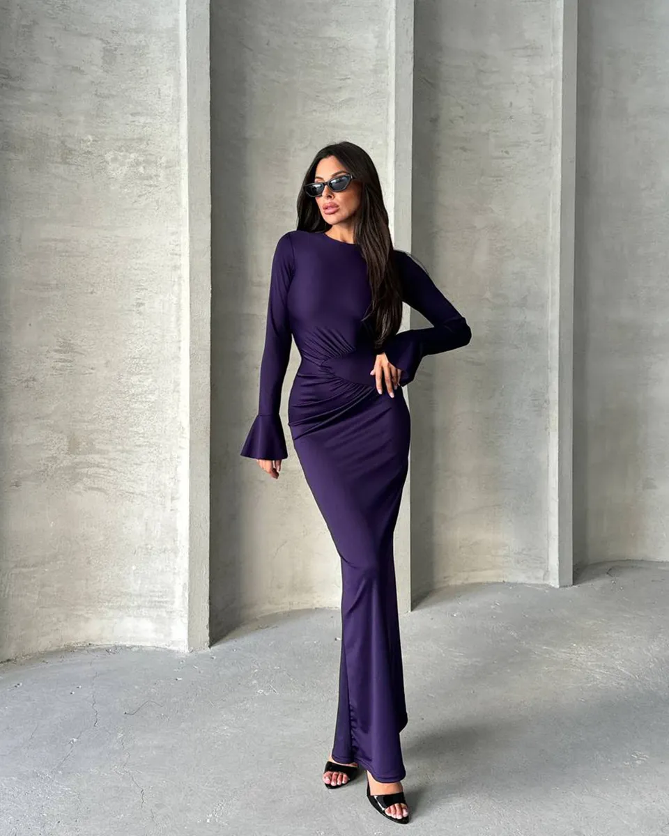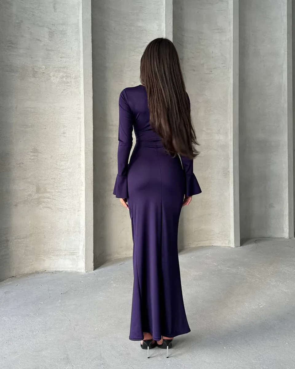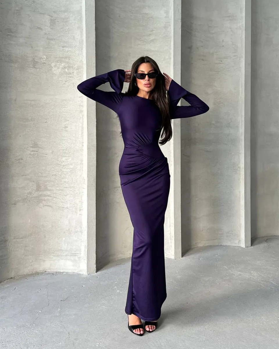 Ova maxi haljina s naborom u struku i zvonastim rukavima odiše elegancijom i lakoćom. Blago providna i rastezljiva, idealna je za udobno nošenje i elegantan izgled. Nabor u struku naglašava figuru, dok zvonasti rukavi daju poseban, romantičan dodir. Upute za održavanje: Prati na 30°C, ne sušiti u sušilici, te peglati uz zaštitnu tkaninu ili koristiti paru kako biste očuvali materijal i njegov izgled.