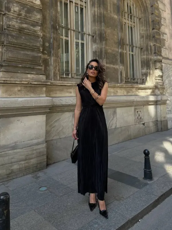 🔹 Kroj: Maxi haljina, plise suknja, bez rukava