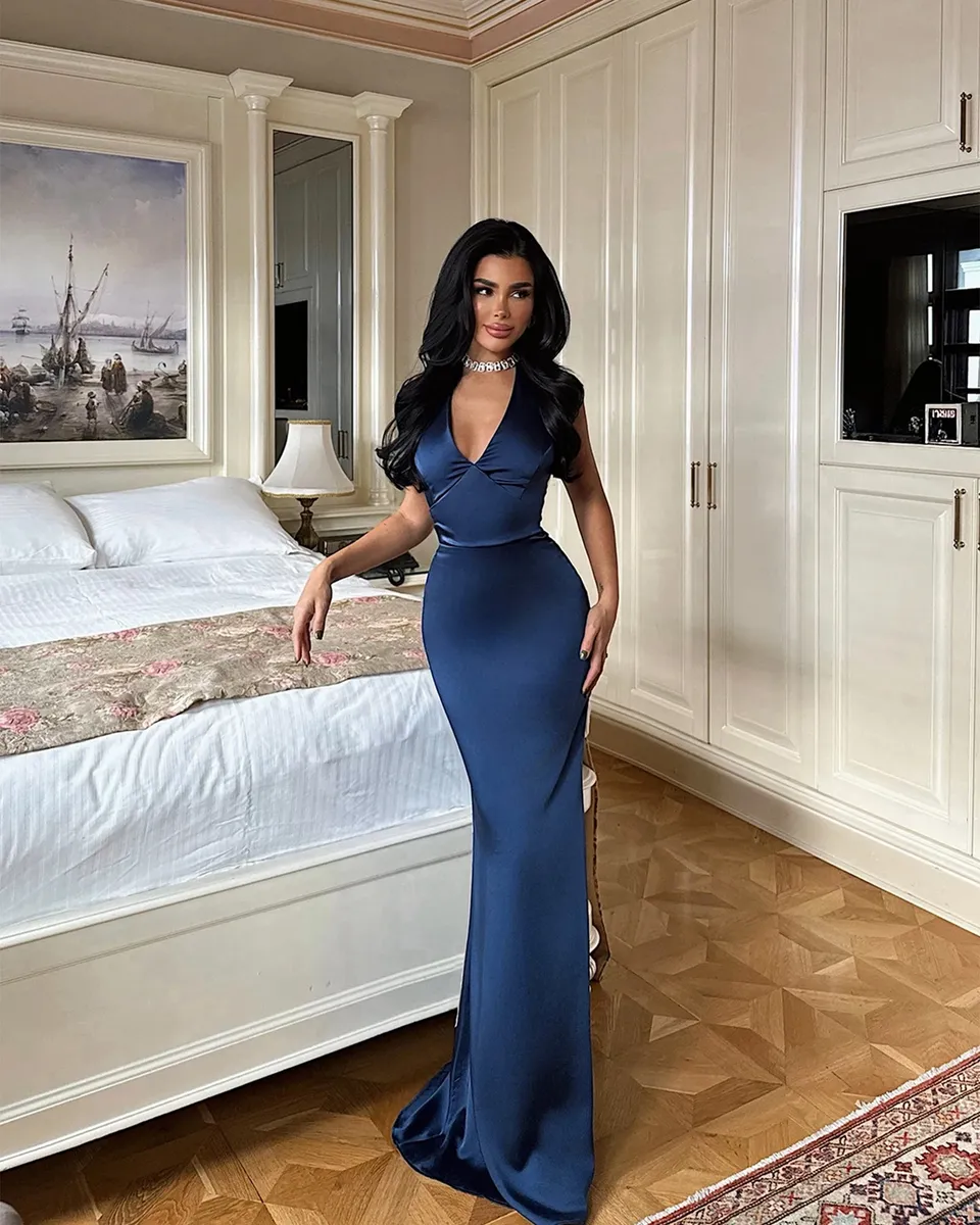 Haljina ima duboki V-izrez i otvorena leÄa s vezanjem oko vrata. Kroj savrÅ”eno prati liniju tijela i pruža luksuzan, glamurozan izgled. Donji dio haljine blago se Å”iri prema dnu, stvarajuÄi sofisticiranu siluetu.