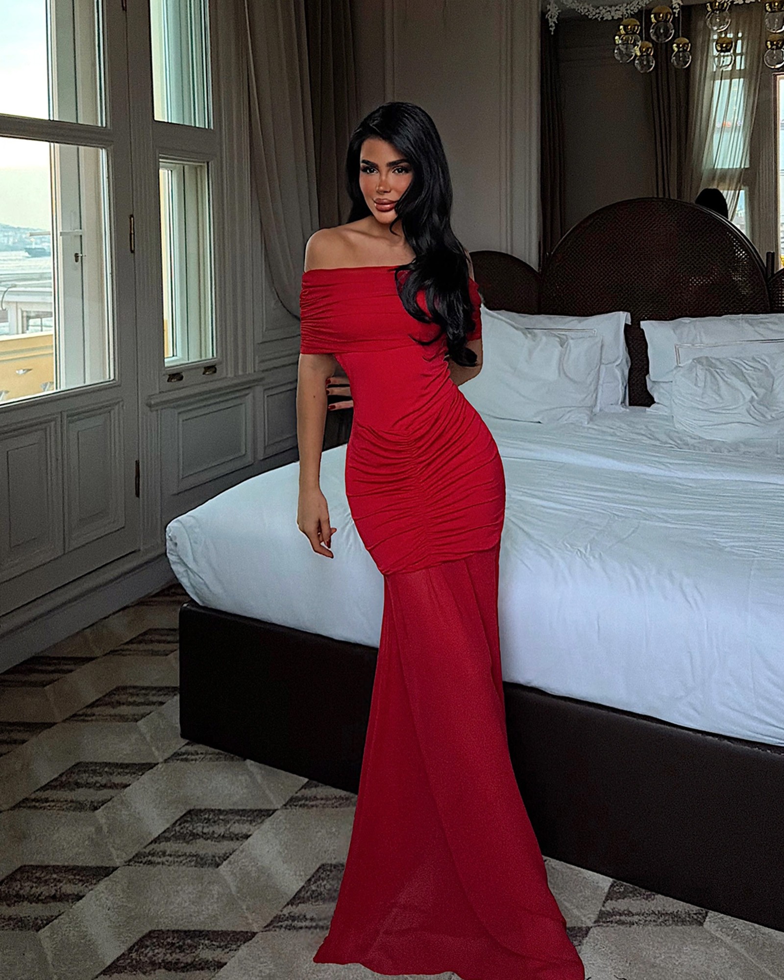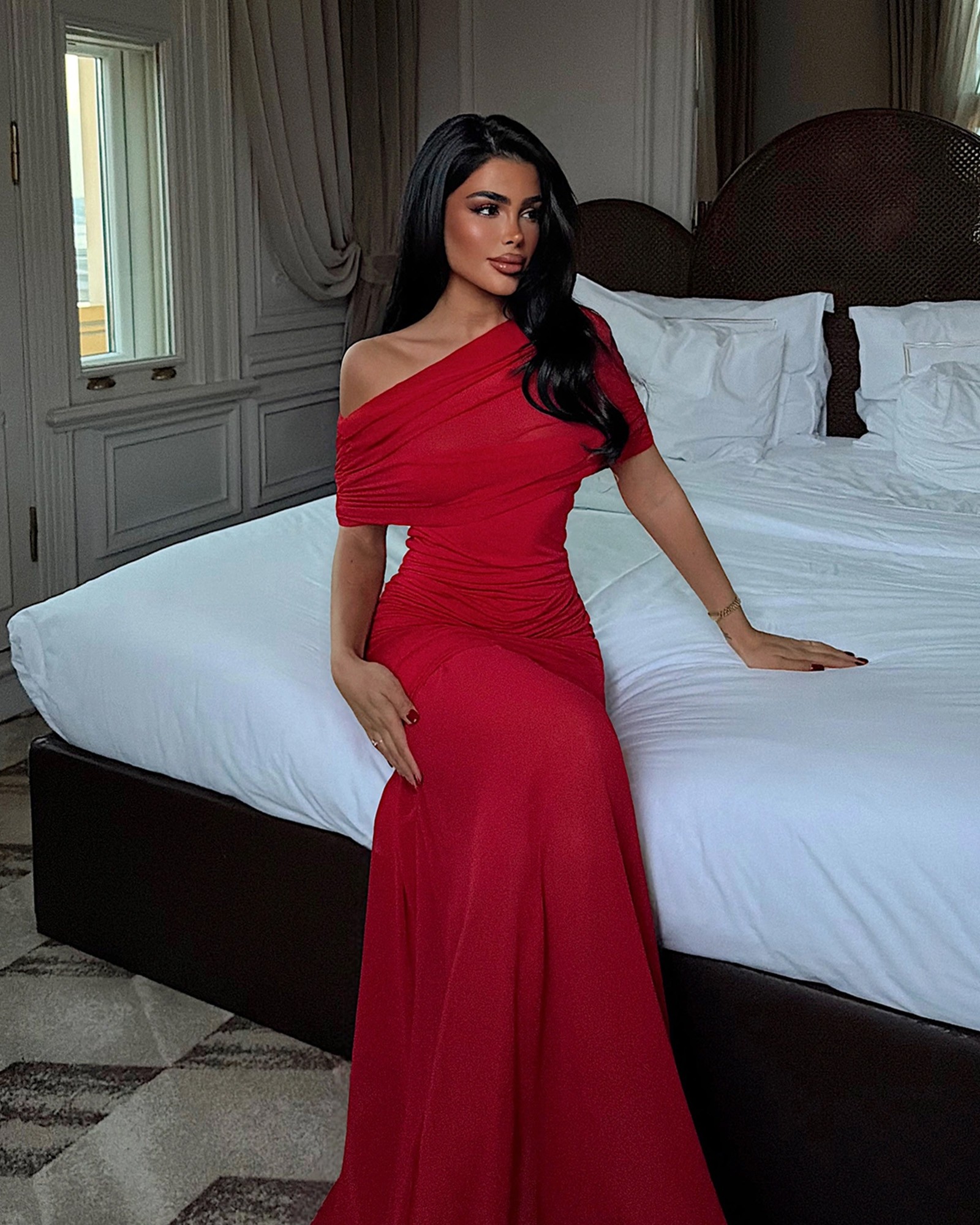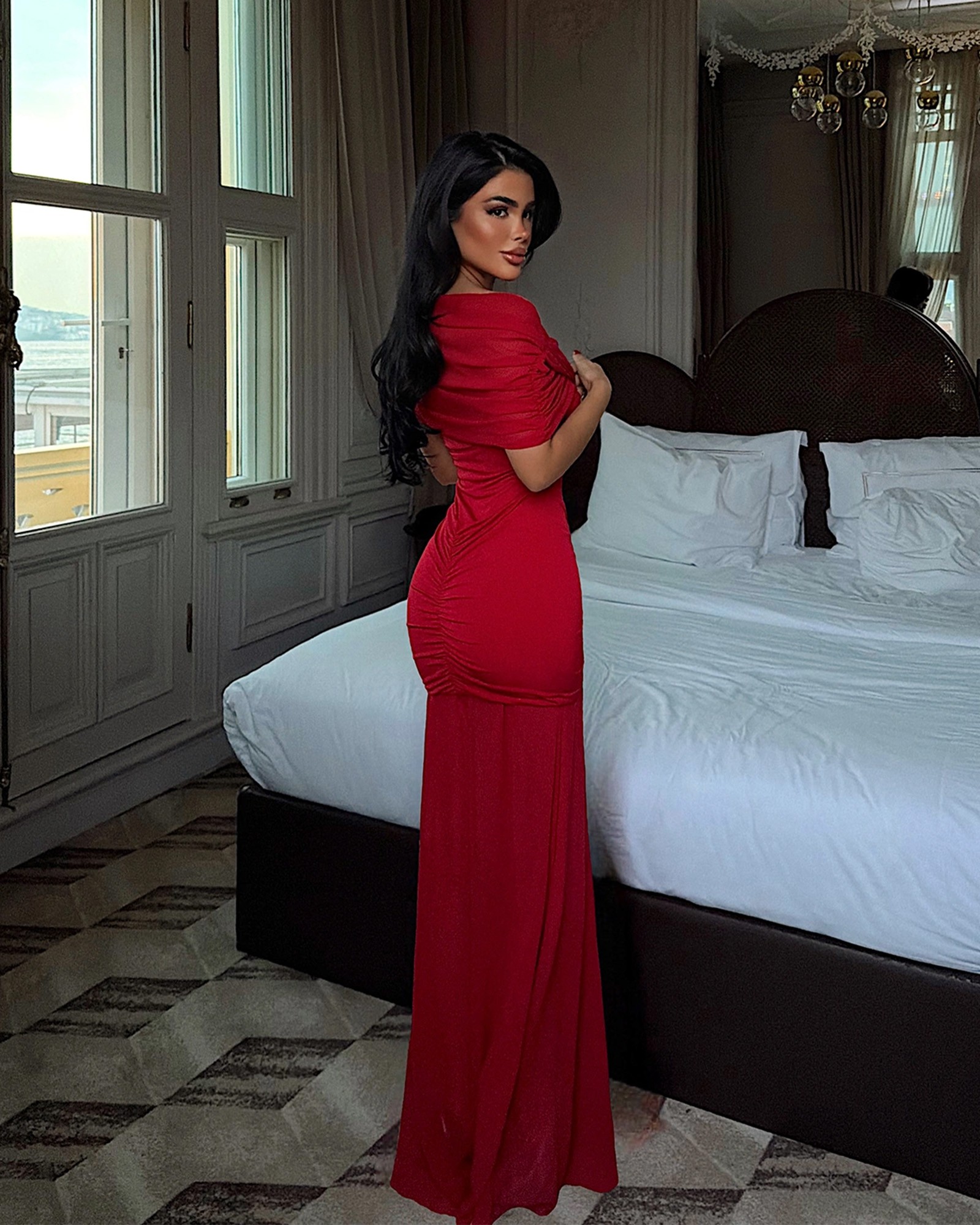 Ako tražiš haljinu koja ostavlja snažan utisak i savršeno prati liniju tijela, ovaj model je pravi izbor. Asimetrični kroj i bogato drapiranje stvaraju ženstvenu siluetu, dok lepršavi donji dio daje dozu elegancije i pokreta.
