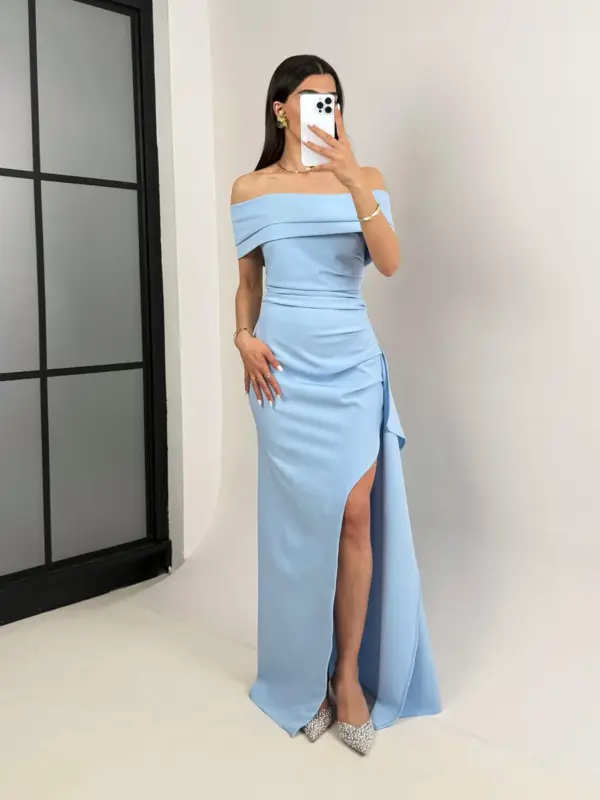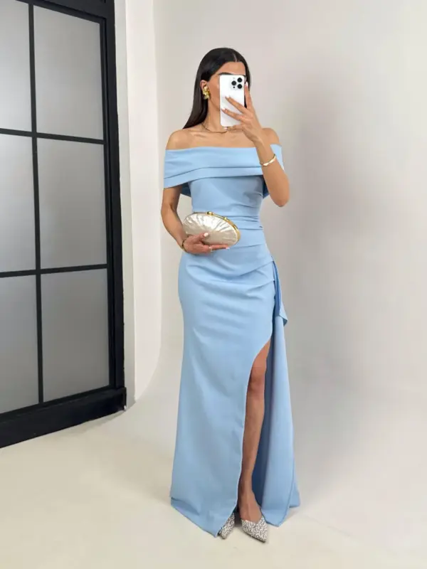 Ova sofisticirana maxi haljina s otvorenim ramenima savršen je izbor za posebne prilike. Pristaje uz tijelo i ističe figuru, dok visoki prorez na jednoj strani dodaje dozu senzualnosti i ženstvenosti. Nabori na gornjem dijelu stvaraju efektan izgled, a mekani materijal lijepo prati liniju tijela.
