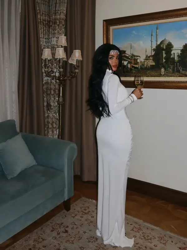 Maxi haljina sa prorezom sa strane i okovratnikom, savršen je izbor za partije. Ističe se detaljem ruže i dubokim izrezom s jedne strane, dodajući notu romantike i senzualnosti. Haljina je podstavljena, ali zbog boje preporučujemo nošenje neutralnog donjeg rublja za diskretan izgled.