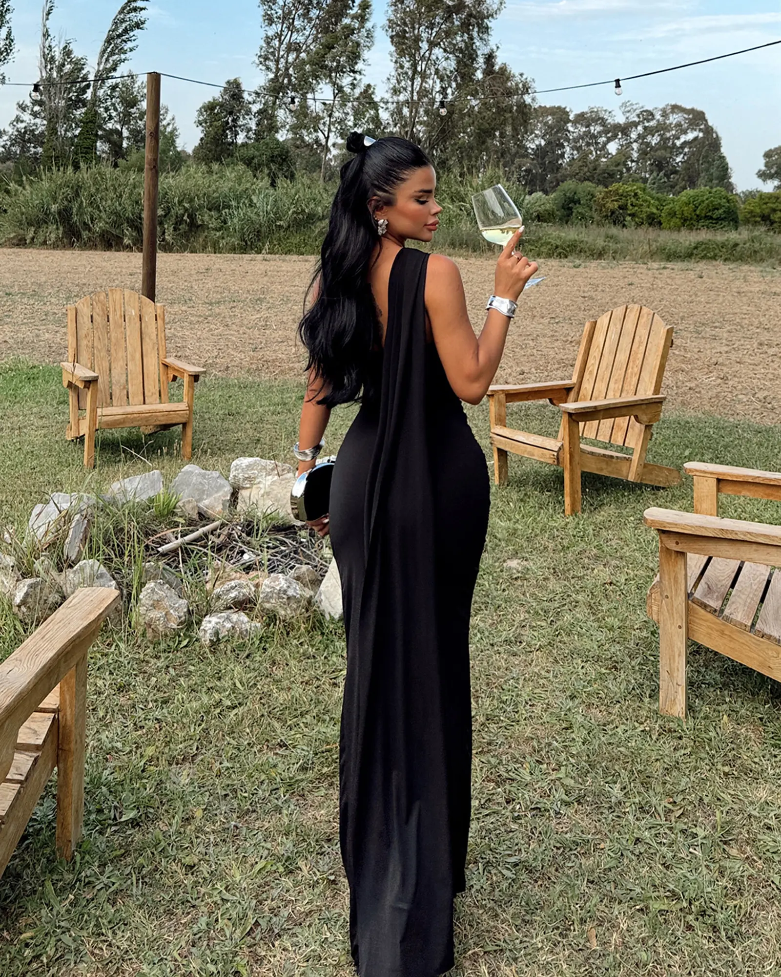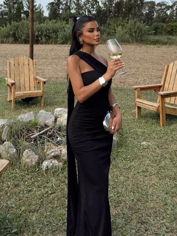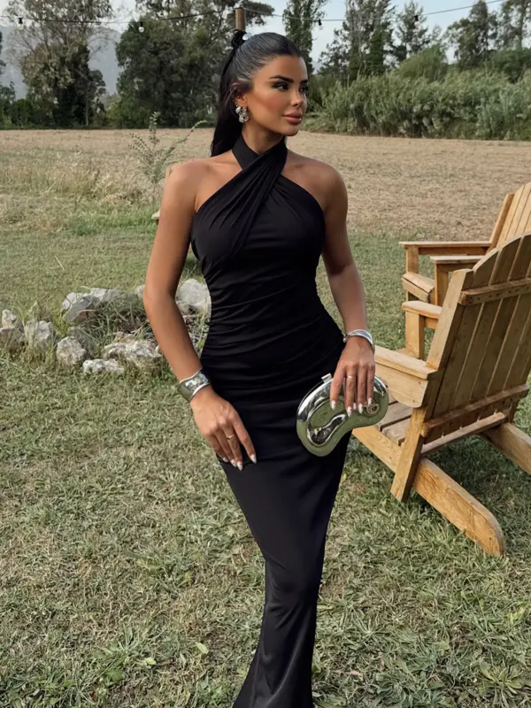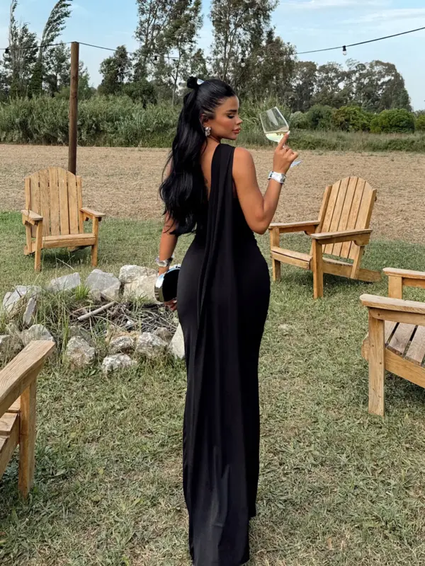 Ova svečana maxi haljina kombinuje udobnost i eleganciju, savršena za posebne prilike. Nabrani dio u struku omogućava prirodno prilagođavanje figuri, ističući siluetu na prefinjen način. Na dnu haljine nalazi se izrez, koji olakšava kretanje i dodaje dozu ležerne elegancije. Donji porub haljine nije obrađen.