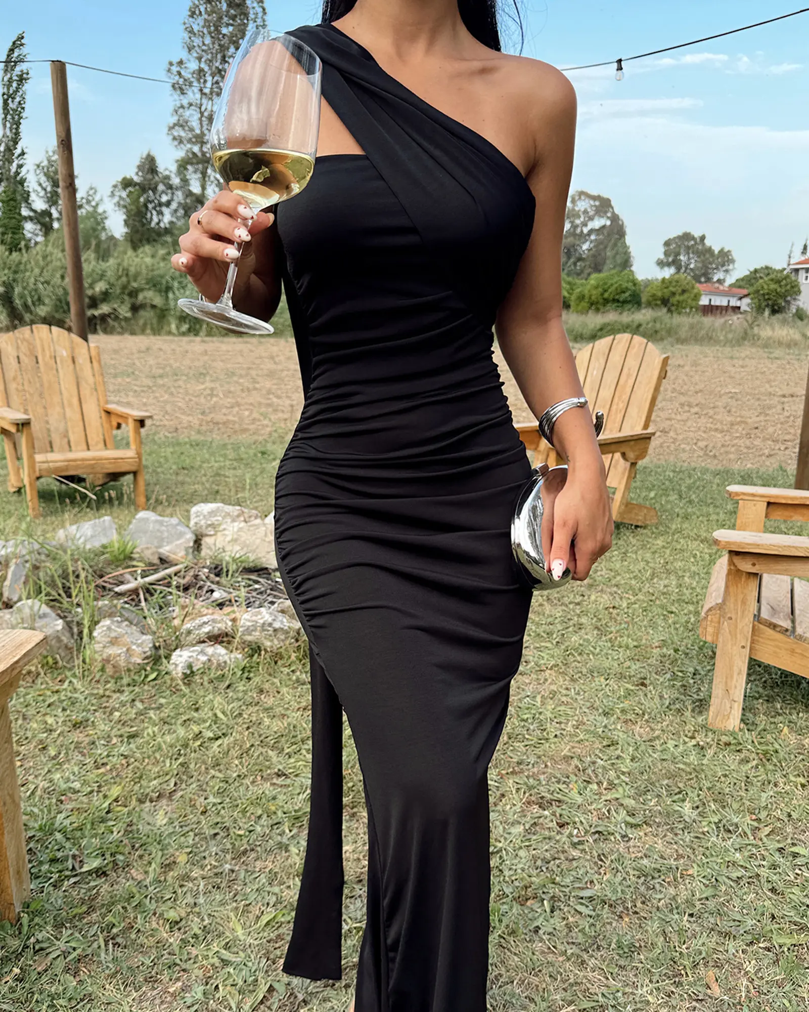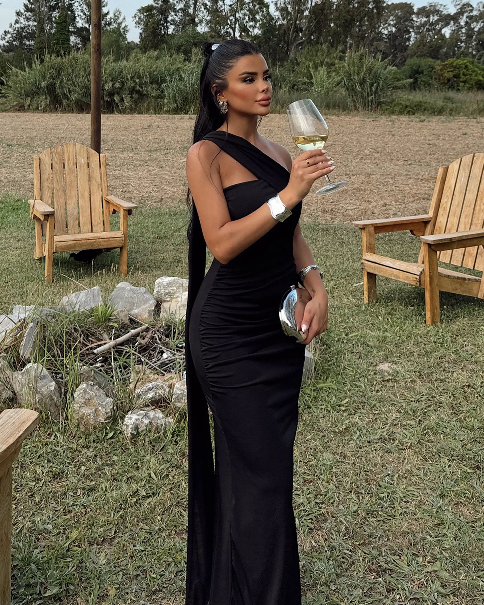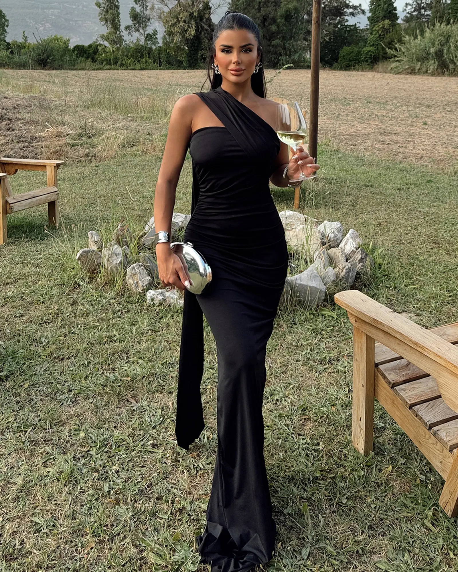 Ova svečana maxi haljina kombinuje udobnost i eleganciju, savršena za posebne prilike. Nabrani dio u struku omogućava prirodno prilagođavanje figuri, ističući siluetu na prefinjen način. Na dnu haljine nalazi se izrez, koji olakšava kretanje i dodaje dozu ležerne elegancije. Donji porub haljine nije obrađen.