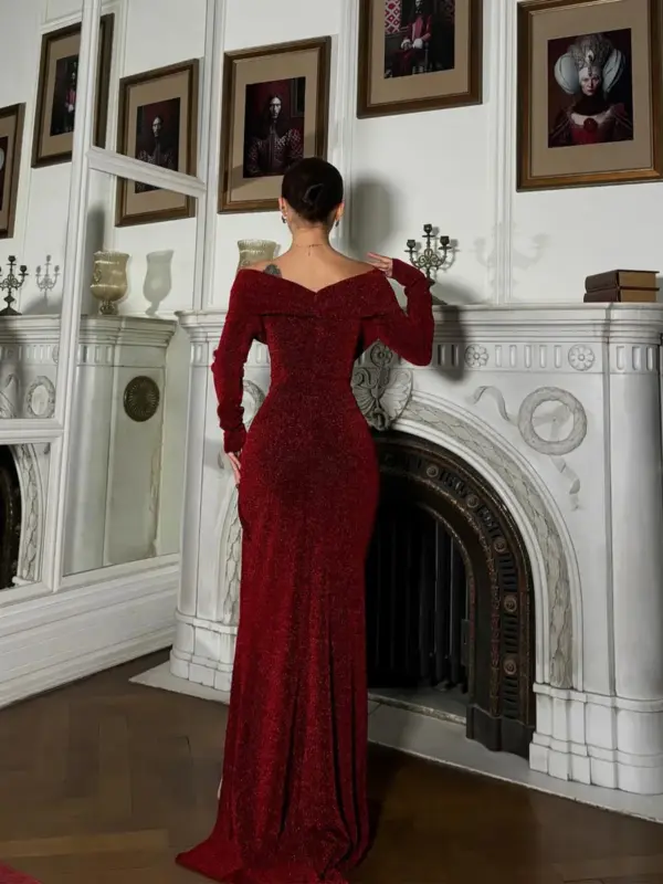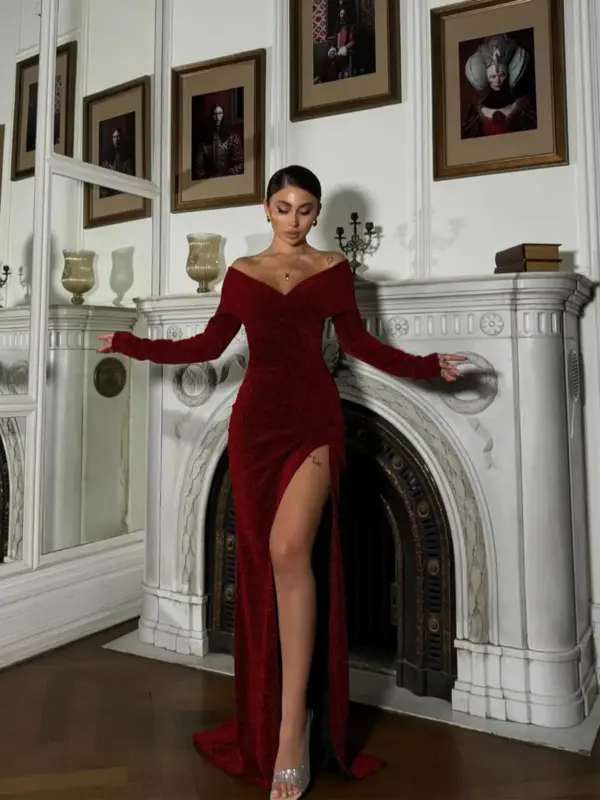 Svečana maxi haljina od svjetlucavog materijala koji ne opada, pružajući elegantan sjaj bez šljokica. Uska i rastezljiva, s naglašenim dekolteom i spuštenim ramenima za sofisticiran izgled. Haljina ima duboki izrezi u donjem dijelu, što omogućava slobodno kretanje, dok nabor u struku dodatno ističe figuru. Idealna je za glamurozne večeri i posebne prilike.