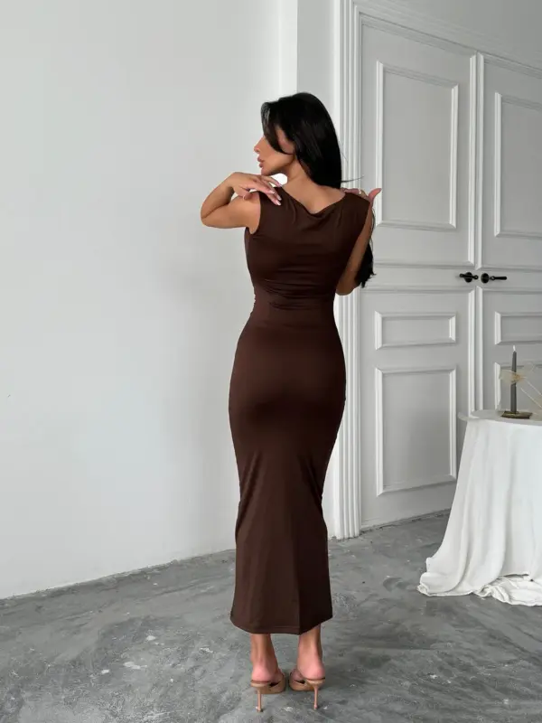 🔹 Kroj: Midi haljina bez rukava, uska silueta