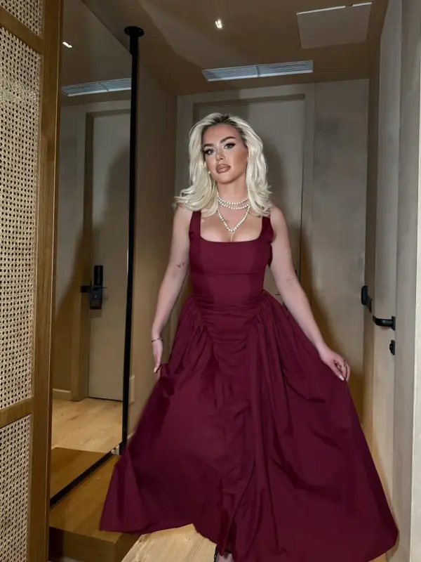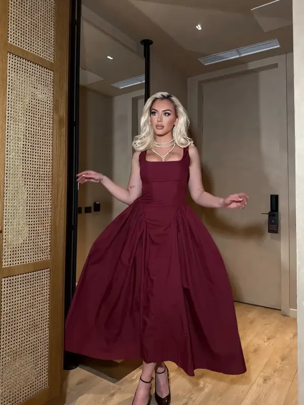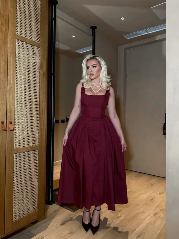 Osjećajte se kao princeza u ovoj glamuroznoj midi haljini! Kroj s korzet detaljem na gornjem dijelu i četvrtastim dekolteom lijepo oblikuje i ističe gornji dio tijela. Velika, nabrana suknja donosi dramatičnost i raskošan izgled, savršen za svečane prigode.