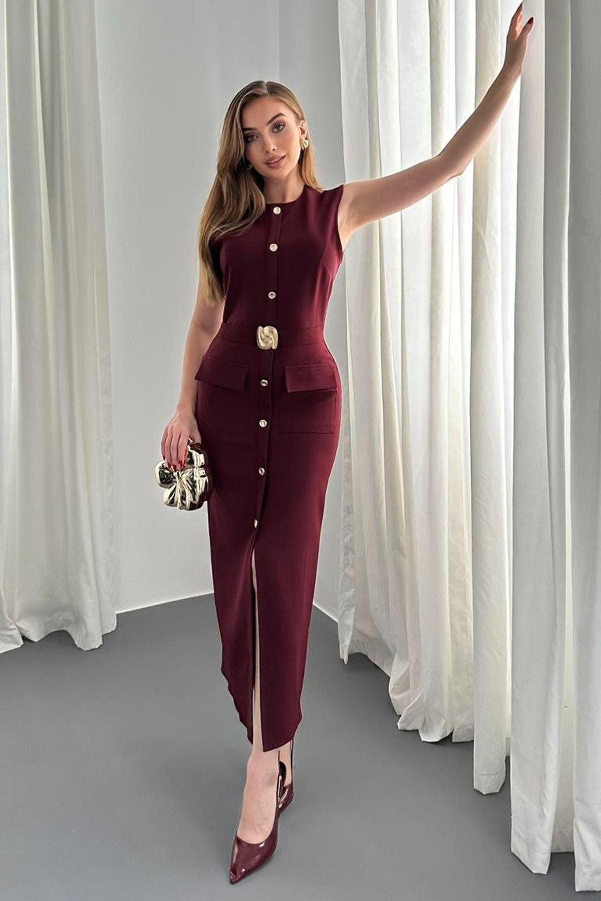 • Kaiš u struku ističe figuru i vizualno sužava struk (kaiš je fiksiran i ne može se skidati), metalni detalj