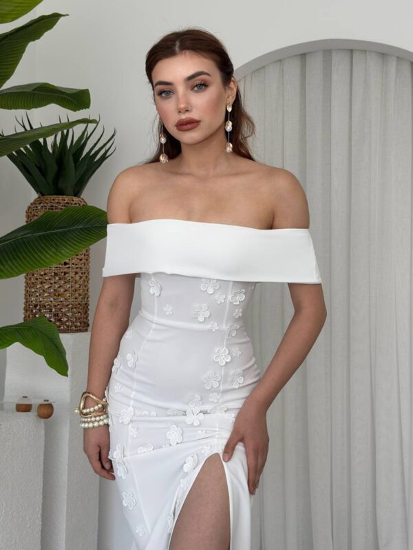 Ova sofisticirana pencil haljina spoj je glamura i profinjenosti, idealna za svečane prilike. Uski kroj prati liniju tijela, dok off‑shoulder omča i bočni visok razrez unose dozu senzualnosti. Nevidljivi patent‑zatvarač pozadi omogućava jednostavno oblačenje, a tanke 3D cvjetne aplikacije daju jedinstven, romantičan pečat.