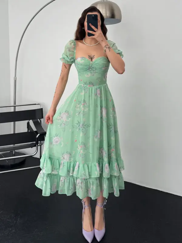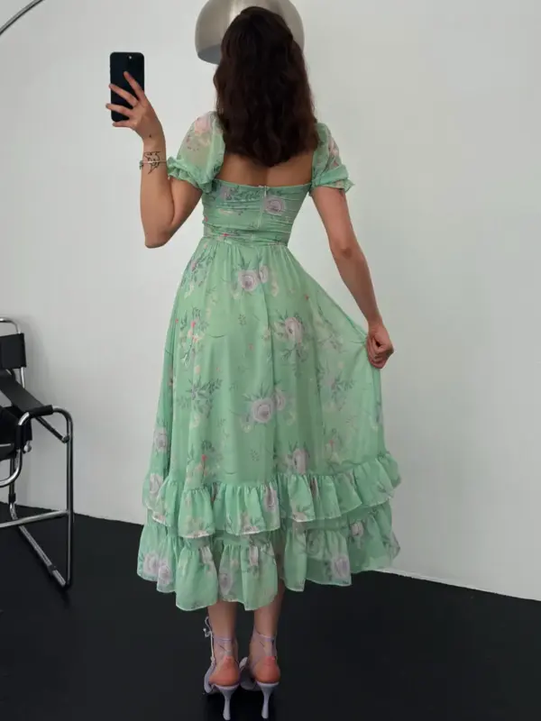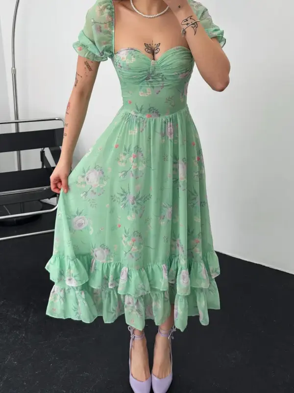 Ako tražiš haljinu koja izgleda kao da je izašla iz bajke, upravo si je pronašla! Ova midi haljina s cvjetnim printom i dvostrukim volanima pri dnu je oličenje ženstvenosti i profinjenosti.