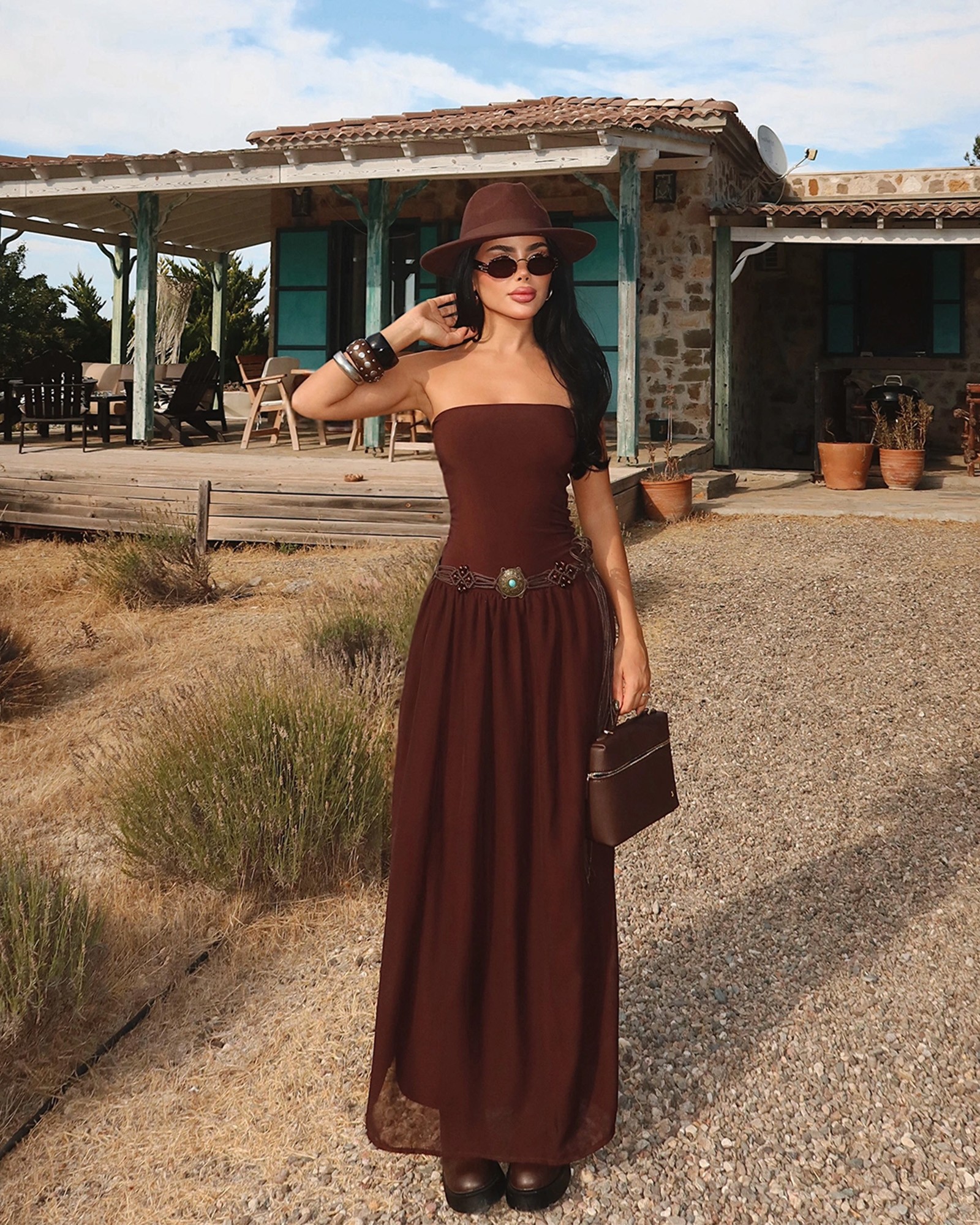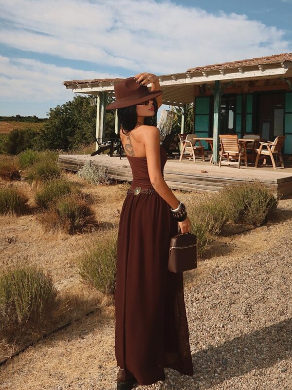 • Prilegnuti gornji dio bez naramenica koji profinjeno ističe liniju, kaiš ne dođe uz haljinu