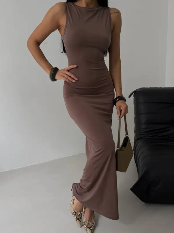 Oblikovana da prati liniju tijela, ova sleeveless haljina donosi savršenu kombinaciju udobnosti i elegancije zahvaljujući mekoj elastičnoj tkanini i minimalističkom kroju.
