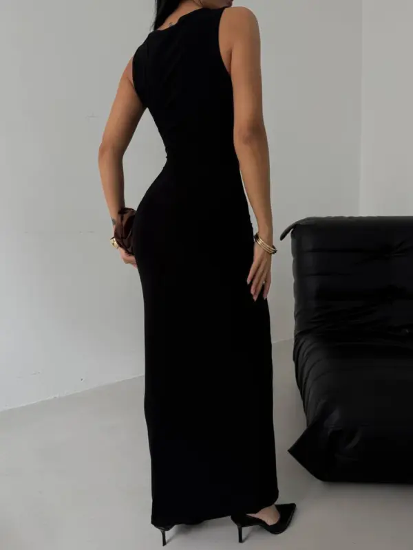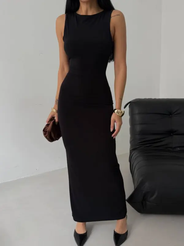 Oblikovana da prati liniju tijela, ova sleeveless haljina donosi savršenu kombinaciju udobnosti i elegancije zahvaljujući mekoj elastičnoj tkanini i minimalističkom kroju.