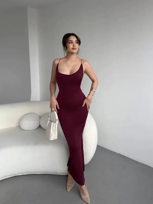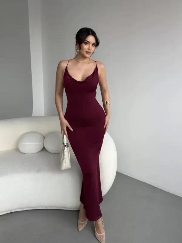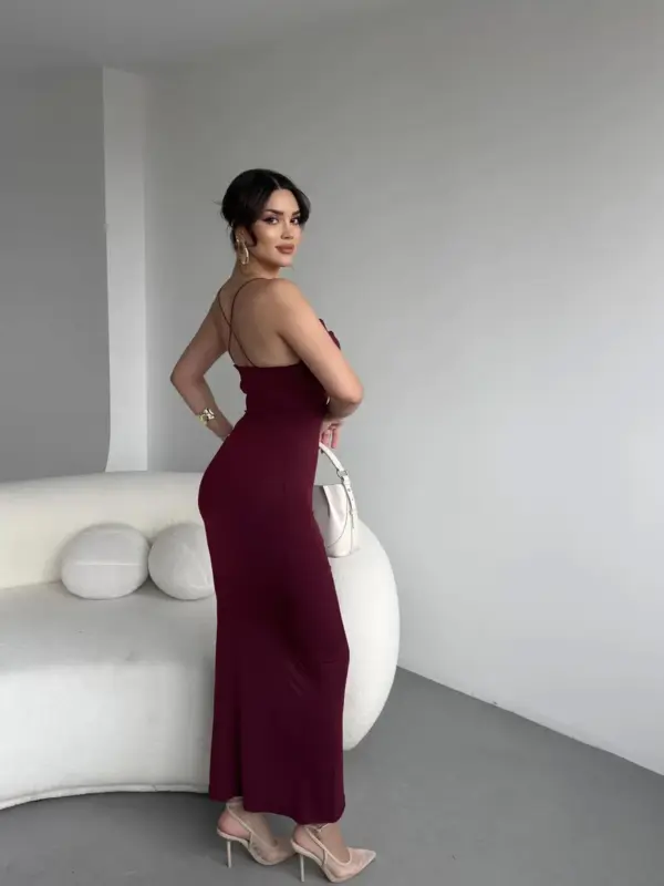 Ova elegantna midi haljina je savršen izbor za sve prigode gdje želite izgledati sofisticirano i privlačno! Drapirani dekolte i tanke bretele unose dozu glamura, dok uska silueta s visokim prorezom na nozi dodaje seksepil i dramatičnost.