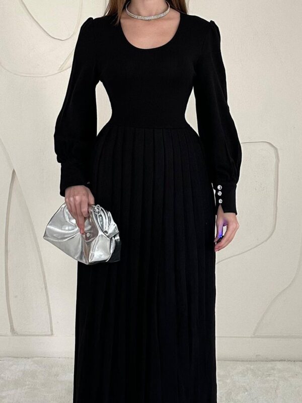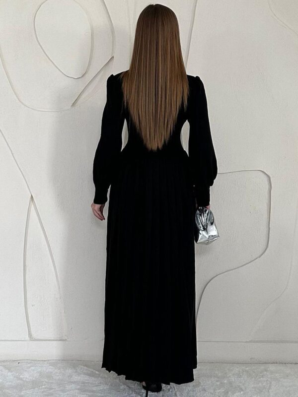 Haljina ima prianjajući gornji dio sa zaobljenim izrezom i dugim, blago puf rukavima, dok se od struka naniže širi u plisiranu suknju dužine do poda. Ovaj kroj vizuelno izdužuje figuru i naglašava struk.