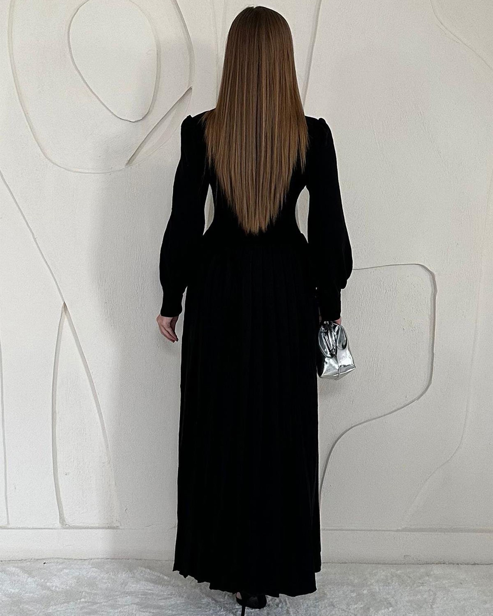 Elegantna i bezvremenska midi haljina koja kombinuje udobnost i profinjenost — idealna za svečane prilike, večere ili poslovne događaje.