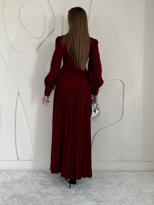 Haljina ima prianjajući gornji dio sa zaobljenim izrezom i dugim, blago puf rukavima, dok se od struka naniže širi u plisiranu suknju dužine do poda. Ovaj kroj vizuelno izdužuje figuru i naglašava struk.