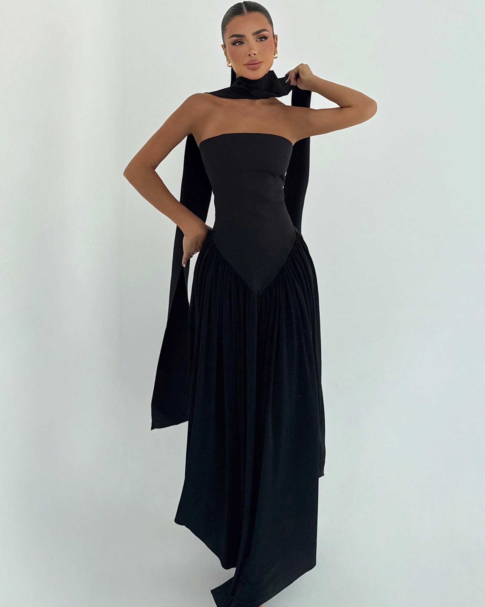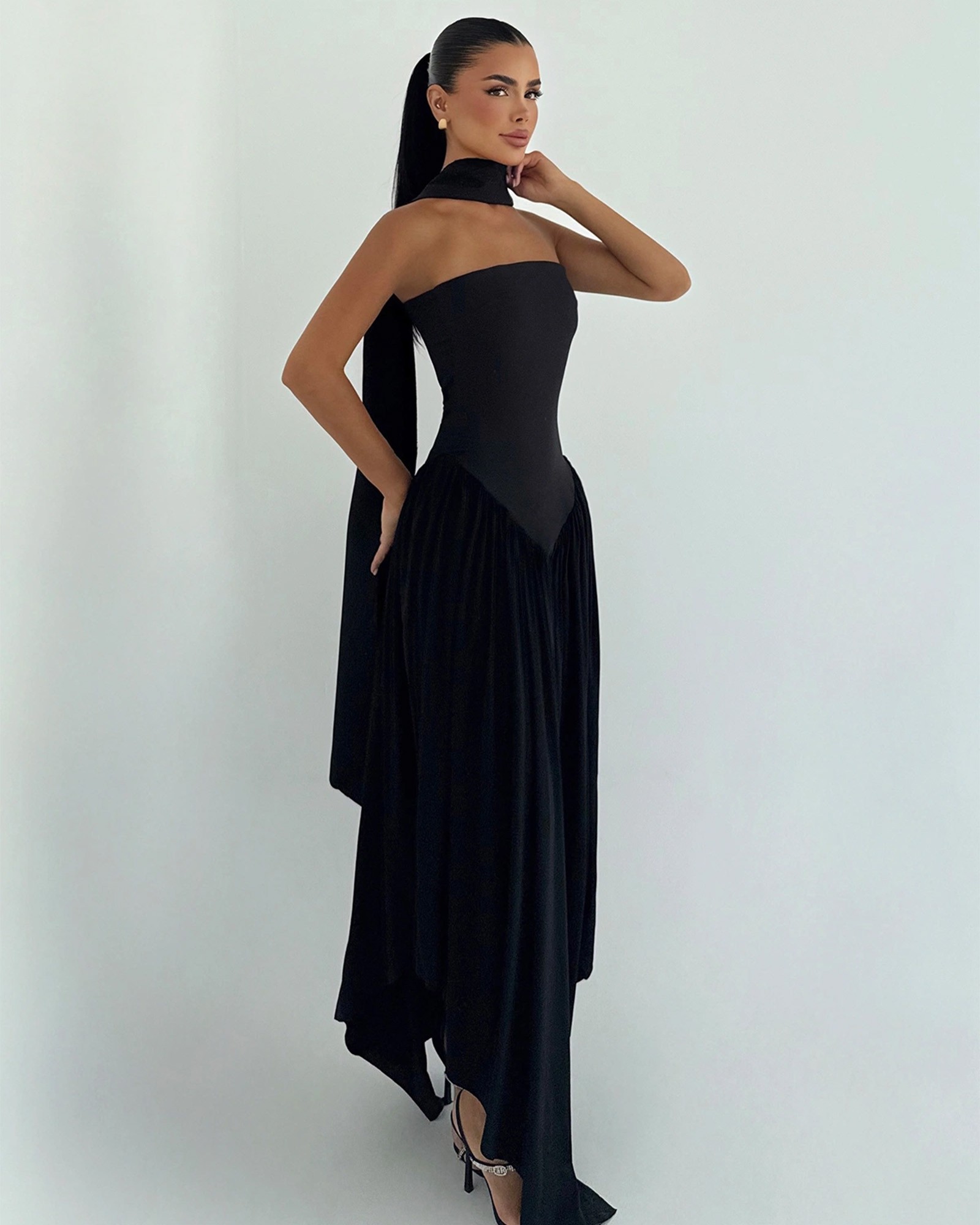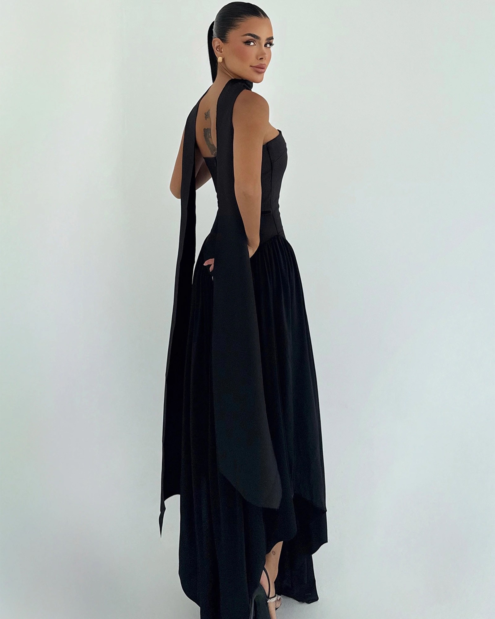 ✨ Asimetrična crna haljina – korzet efekt & duga traka ✨