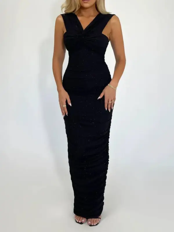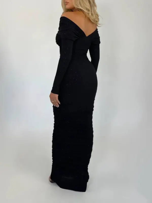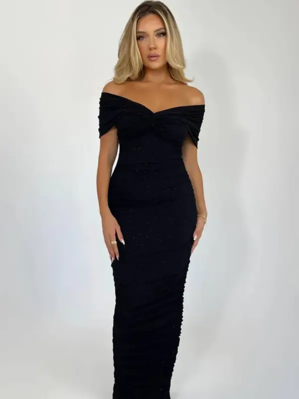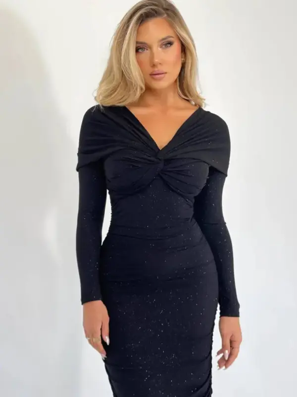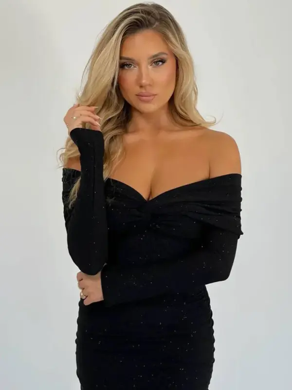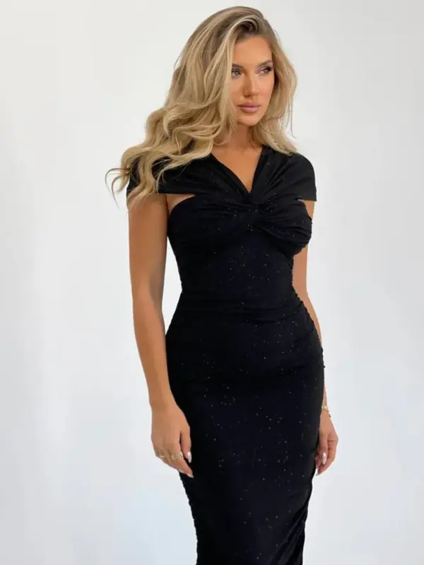 Midi haljina sa spuštenim ramenima, nabrana cijelom dužinom, pruža mogućnost blage prilagodbe dužine zahvaljujući svojoj teksturi. Ovaj model dolazi s podesivim naramenicama koje se mogu nositi na više načina, omogućavajući različite stilove prema vašem ukusu. Uz haljinu dolaze i odvojene rukavice koje se mogu nositi kao dodatni rukavi ili ostaviti po strani za drugačiji izgled. Idealna za svečane prilike i partije, haljina je savršen izbor za one koji vole da zablistaju.