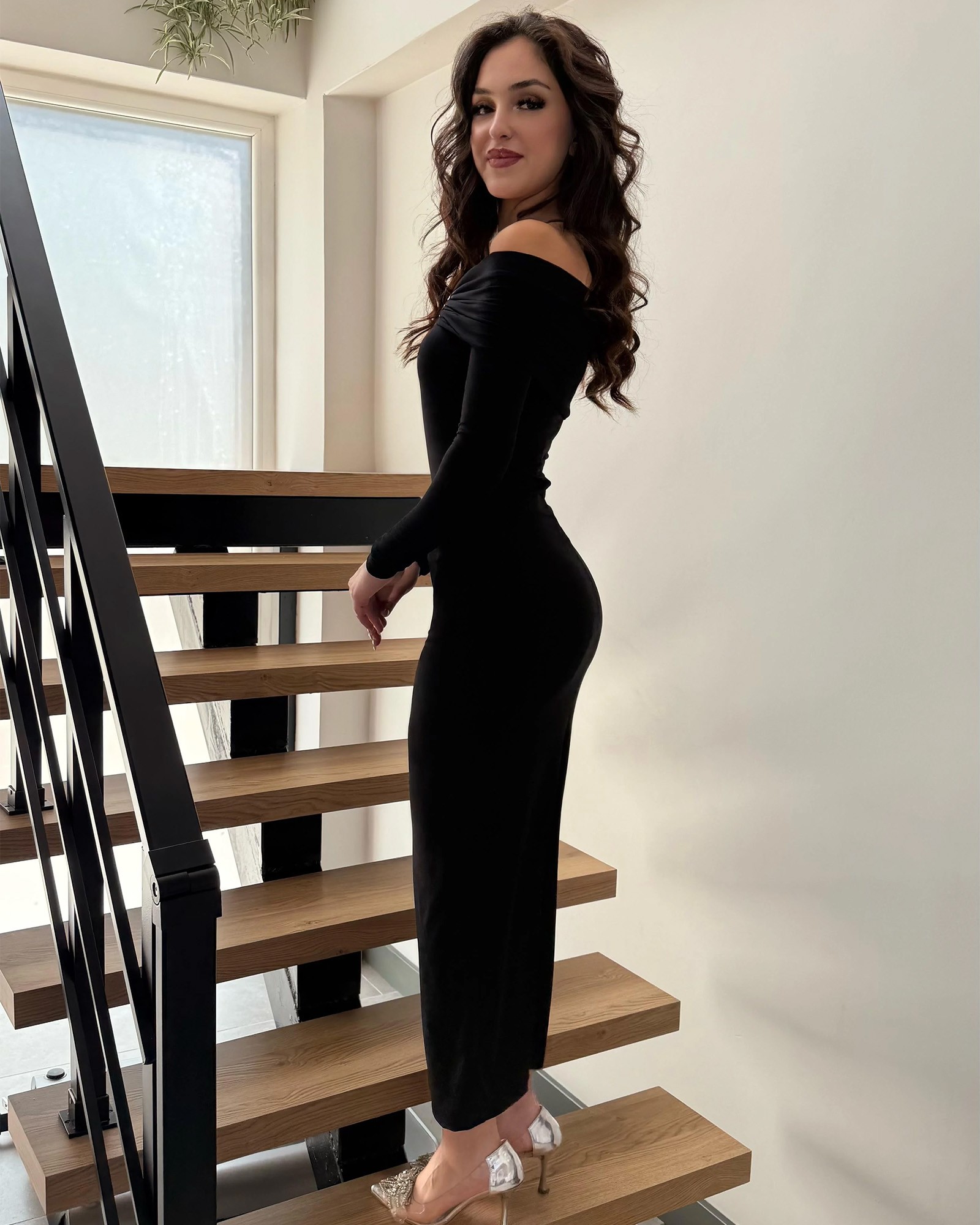 - Off-shoulder model koji naglašava ramena i dekolte