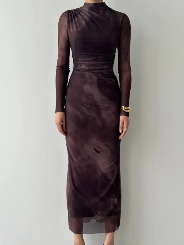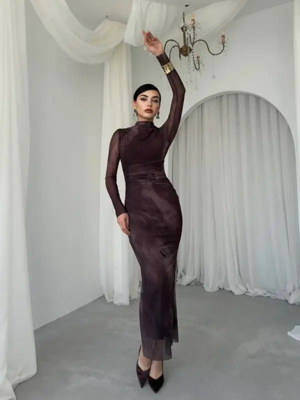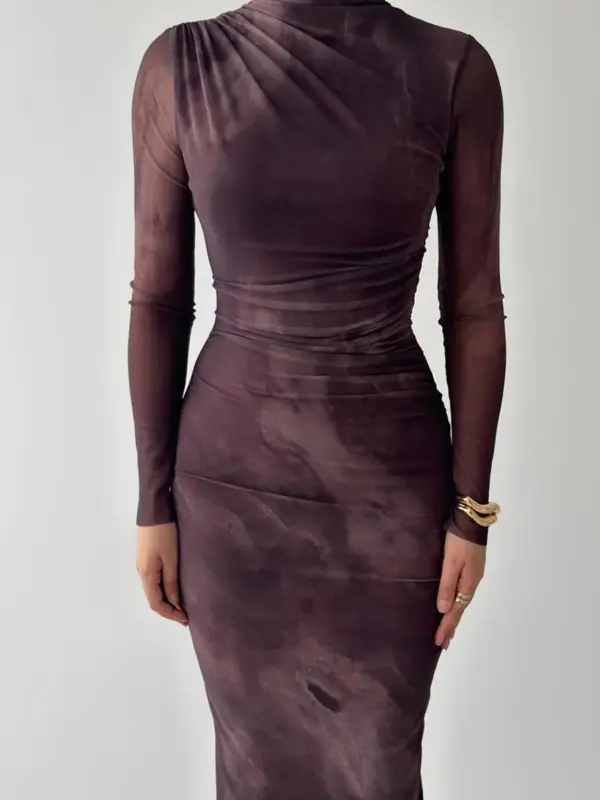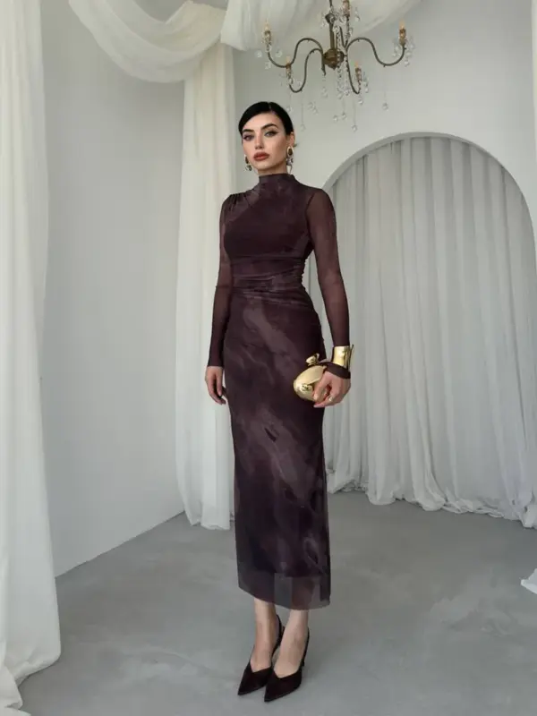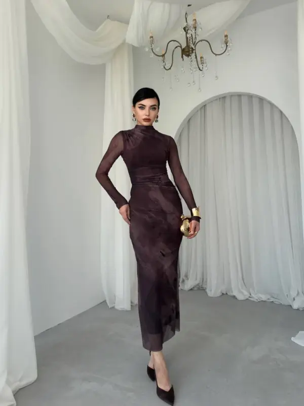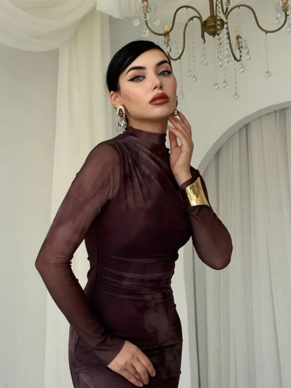 Midi haljina s podstavom i slojem tila preko, elegantnog dizajna koji naglašava ženstvenu siluetu. Nabranost u struku osigurava figuralno prilagođavanje, dok rastezljivost materijala pruža udobnost. S ovratnikom, bez izreza i neobrađenog donjeg poruba, ova haljina kombinira sofisticiranost i moderni izgled.