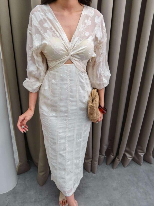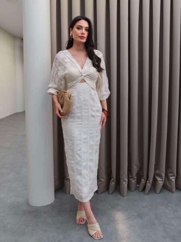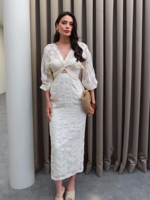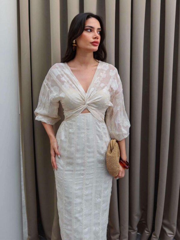 Ova sofisticirana midi haljina spaja profinjen kroj uz tijelo s romantičnim, prozirnim gornjim dijelom. Idealna je za večernje izlaske, svečane evente ili romantične večere.